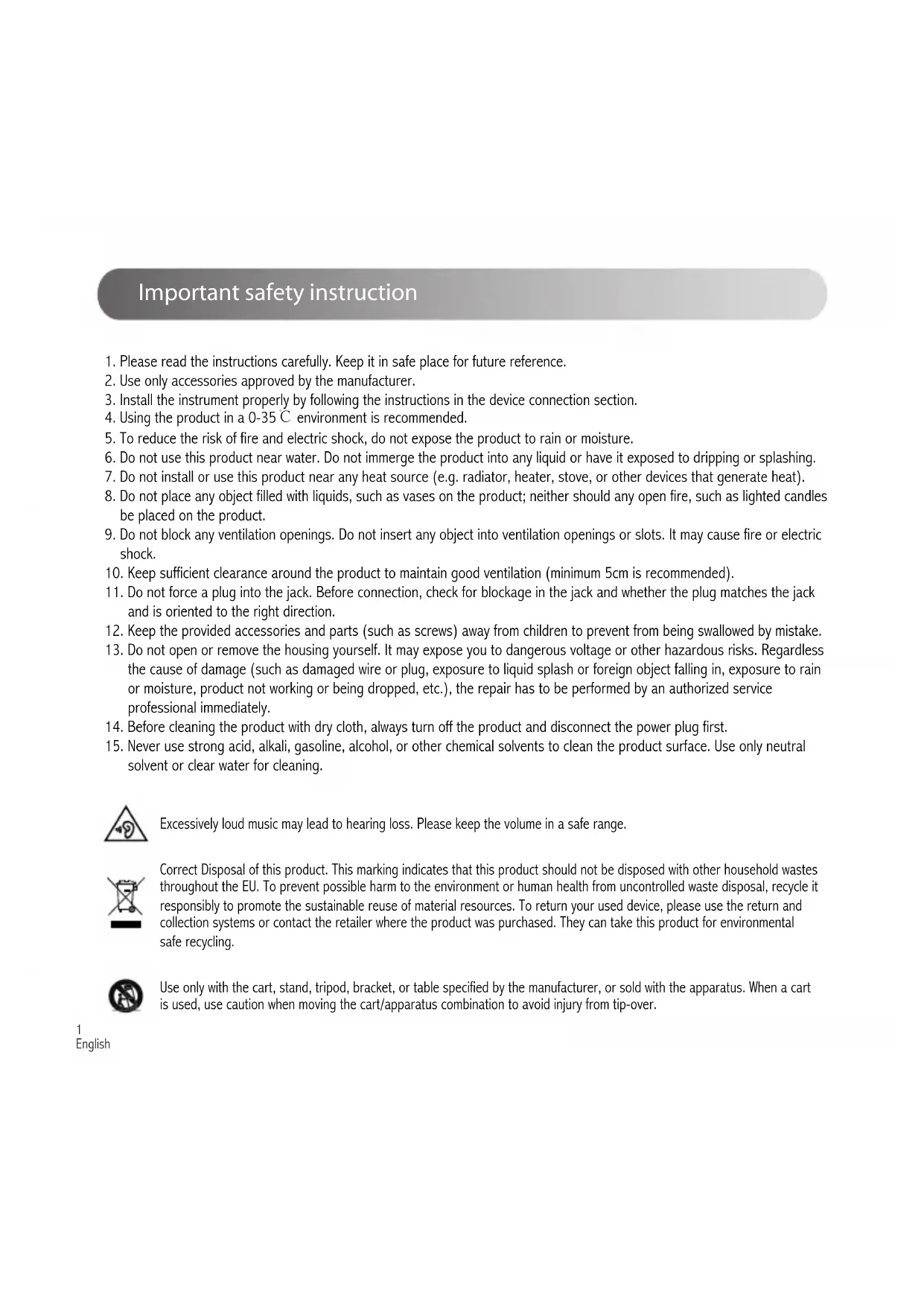 15. Never use strong acid, alkali, gasoline, alcohol, or other chemical solvents to clean the product surface. Use only neutral solvent or clear water for cleaning.2 English Important safety instruction This symbol is to alert the user to the presence of un-insulated dangerous voltage within the product's enclosure that may be of sufficient magnitude to constitute a risk of electric shock to persons. This symbol is to warn the user not to disassemble the enclosure of the product and there is no user-replaceable part inside. Take the product to an authorized service center for repair. This symbol indicates that the product is for indoor use only. This symbol indicates that the product is a CLASS II or double insulated electrical device with no earth requirement. Power warning:
