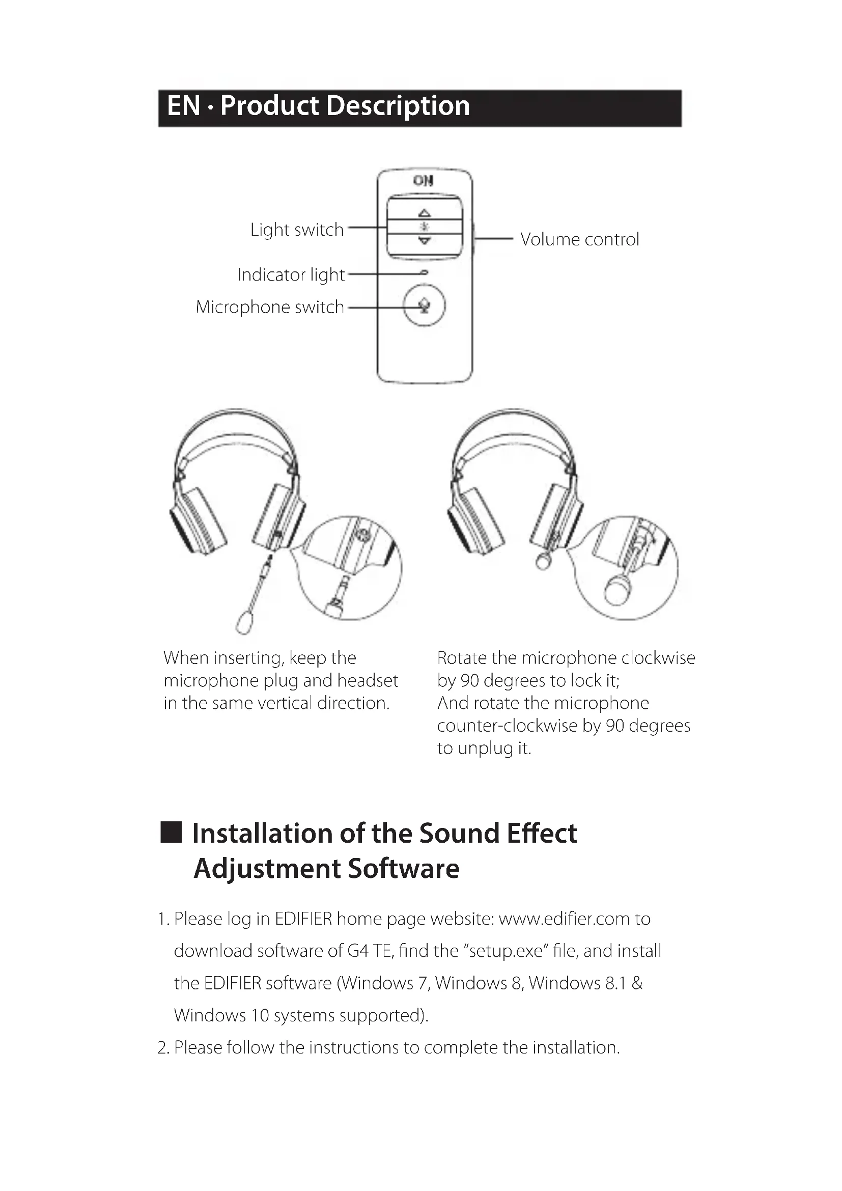 Light switch Volume control Indicator light Microphone switch When inserting, keep the microphone plug and headset in the same vertical direction. Rotate the microphone clockwise by 90 degrees to lock it; And rotate the microphone counter-clockwise by 90 degrees to unplug it. EN · Product Description• Keep the product away from humid places to avoid affecting internal circuit. Do not use the product during intense exercise or with much sweat to prevent sweat from dropping into the product to make damage.