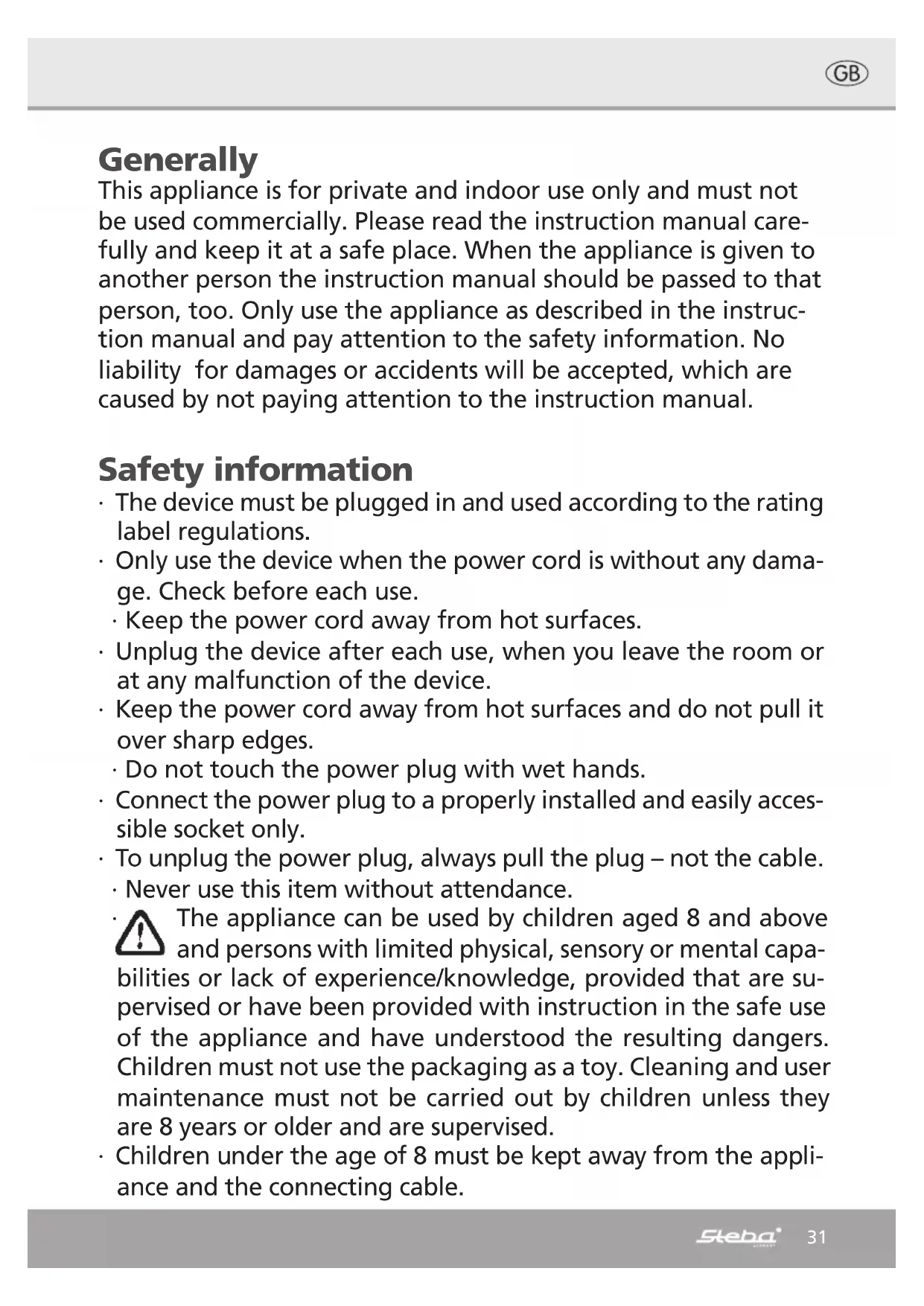 The appliance can be used by children aged 8 and above and persons with limited physical, sensory or mental capa- bilities or lack of experience/knowledge, provided that are su- pervised or have been provided with instruction in the safe use of the appliance and have understood the resulting dangers. Children must not use the packaging as a toy. Cleaning and user maintenance must not be carried out by children unless they are 8 years or older and are supervised. ∙ Children under the age of 8 must be kept away from the appli- ance and the connecting cable.32 ∙ Children should not play near the device. ∙ The appliance must not be operated using a timer or a separate remote system! ∙ This grill is an electrical device! Never run in the rain or on wet surfaces. ∙ Never keep the appliance outdoor or in damp rooms. ∙ Do not immerse the appliance in water or you do not spray it off with a garden hose. ∙ Never operate the appliance without the reflectors and the gre- ase drip trays. ∙ If the grill is used indoor, adequate ventilation must be provi- ded. ∙ Close the lid before transportation. ∙ Only use the device for food preparation ∙ Never use the device after a malfunction, e.g. when it was fal- len down or was damaged in any way. ∙ The producer takes no responsibility for wrong use, which co- mes from not obeying the instruction manual ∙ To avoid any dangers must repairs, e.g. change of a defect po- wer cord, only be done by our service or an authorised compa- ny. ∙ Device gets hot. Only transport after it cooled down. ∙ If the appliance is used as a table top, it must be placed on a even, stable and heat resisting surface (e.g. Not on painted fur- niture) and keep away (min 70cm) of burnable materials (e.g. curtains) ∙ Before the first use: Clean all parts and dry them afterwards. To get rid of the new smell, heat up device for 15 minutes with top closed. Apply a light coating of cooking oil to griddle before- hand. After cooling, wash griddle in soapy water and dry.