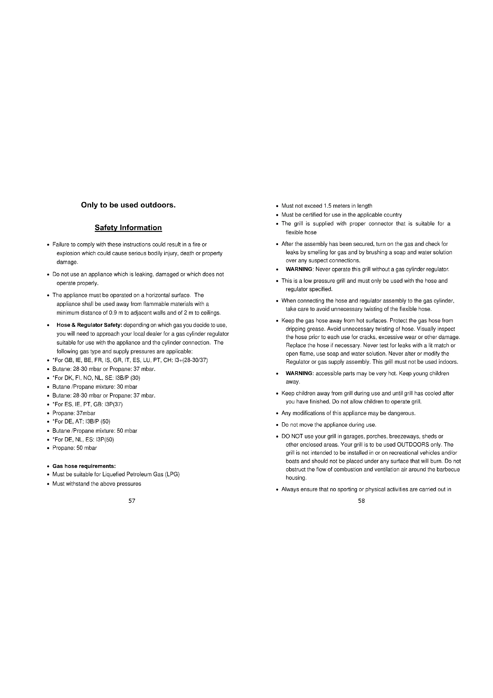 Supply Pressure (mbar) Destination Countries I3+(28-30/37) GB, IE, BE, CH, ES, FR, GR, IT & PT I3 B/P (30) DK, FI, GR, LU, NL, NO & SE I3 B/P (50) AT, CH & DE This appliance must be used with the appropriate gas and at the correct gas pressures. Failure to comply may result in a hazardous situation.57 Only to be used outdoors. Safety Information Failure to comply with these instructions could result in a fire or explosion which could cause serious bodily injury, death or property damage. Do not use an appliance which is leaking, damaged or which does not operate properly. The appliance must be operated on a horizontal surface. The appliance shall be used away from flammable materials with a minimum distance of 0.9 m to adjacent walls and of 2 m to ceilings. Hose & Regulator Safety: depending on which gas you decide to use, you will need to approach your local dealer for a gas cylinder regulator suitable for use with the appliance and the cylinder connection. The following gas type and supply pressures are applicable: *For GB, IE, BE, FR, IS, GR, IT, ES, LU, PT, CH: I3+(28-30/37) Butane: 28-30 mbar or Propane: 37 mbar. *For DK, FI, NO, NL, SE: I3B/P (30) Butane /Propane mixture: 30 mbar Butane: 28-30 mbar or Propane: 37 mbar. *For ES, IE, PT, GB: I3P(37) Propane: 37mbar *For DE, AT: I3B/P (50) Butane /Propane mixture: 50 mbar *For DE, NL, ES: I3P(50) Propane: 50 mbar Gas hose requirements: Must be suitable for Liquefied Petroleum Gas (LPG) Must withstand the above pressures