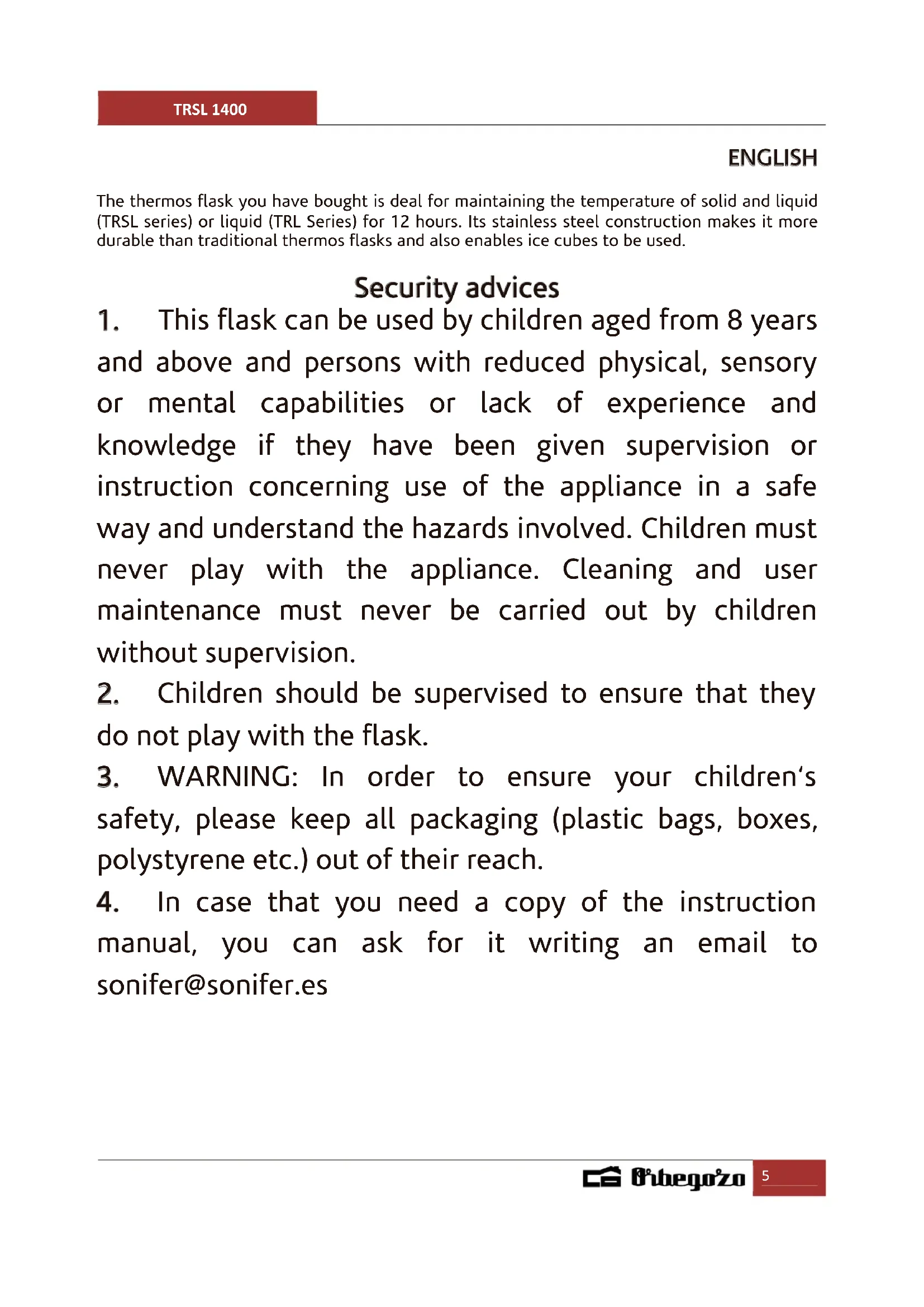 ENGLISH The thermos flask you have bought is deal for maintaining the temperature of solid and liquid (TRSL series) or liquid (TRL Series) for 12 hours. Its stainless steel construction makes it more durable than traditional thermos flasks and also enables ice cubes to be used. Security advices