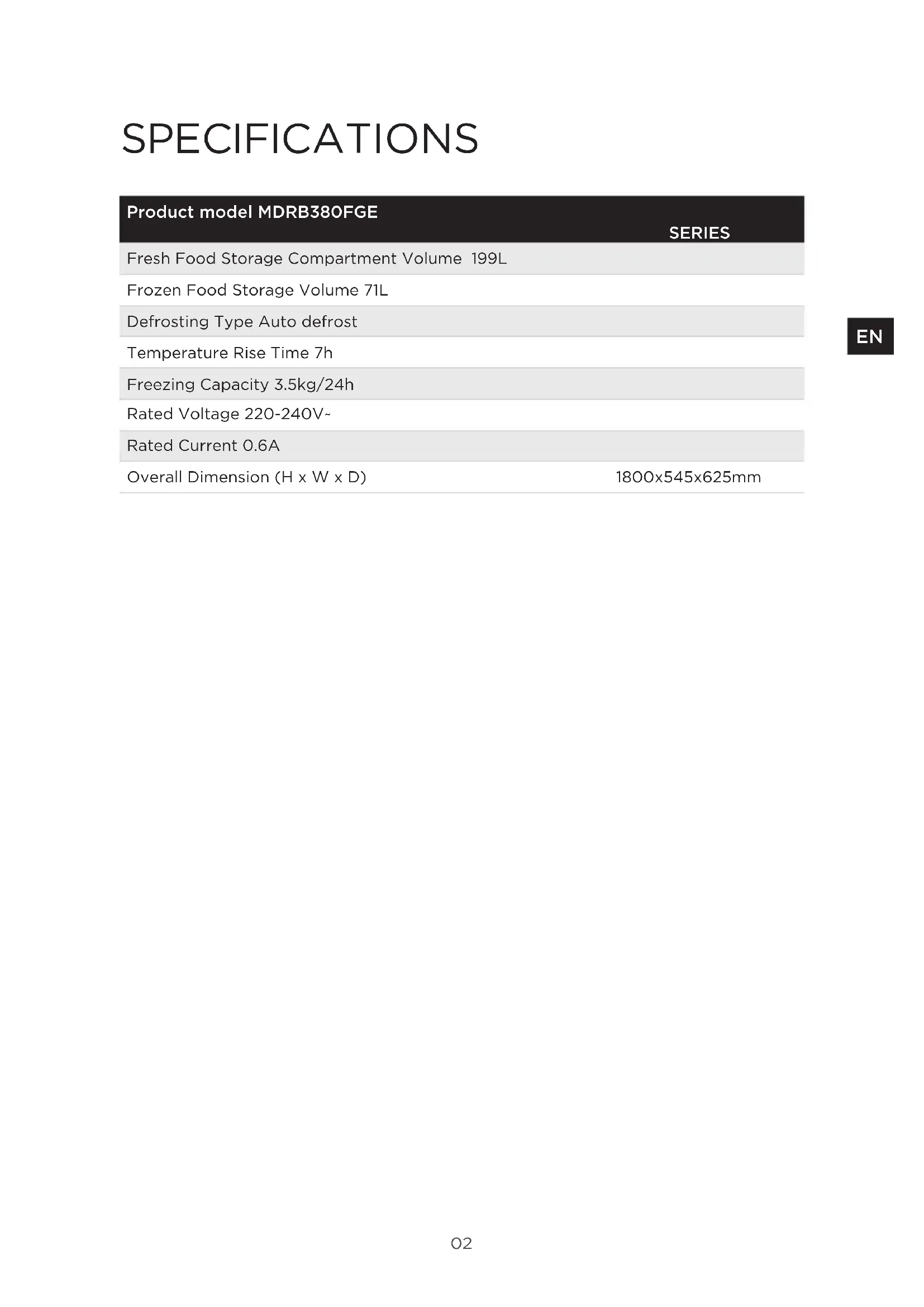 SPECIFICATIONS Product model MDRB380FGE SERIES Fresh Food Storage Compartment Volume 199L Frozen Food Storage Volume 71L Defrosting Type Auto defrost Temperature Rise Time 7h Freezing Capacity 3.5kg/24h Rated Voltage 220-240V~ Rated Current 0.6A Overall Dimension (H x W x D) 1800x545x625mm03 PRODUCT OVERVIEW Names of components