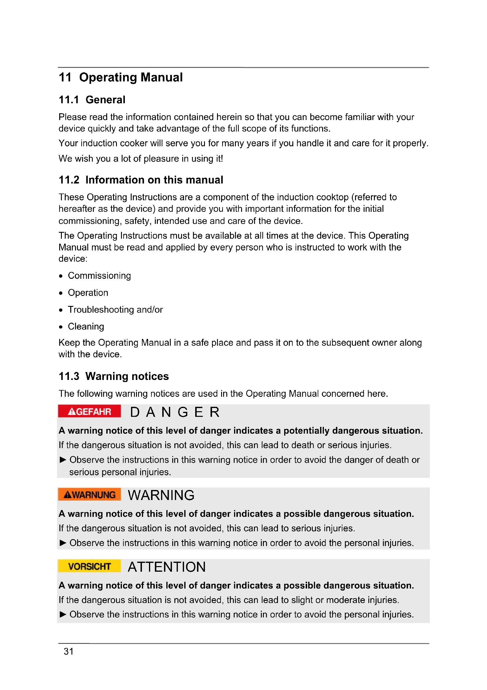 These Operating Instructions are a component of the induction cooktop (referred to hereafter as the device) and provide you with important information for the initial commissioning, safety, intended use and care of the device. The Operating Instructions must be available at all times at the device. This Operating Manual must be read and applied by every person who is instructed to work with the device: Commissioning Operation Troubleshooting and/or Cleaning Keep the Operating Manual in a safe place and pass it on to the subsequent owner along with the device.