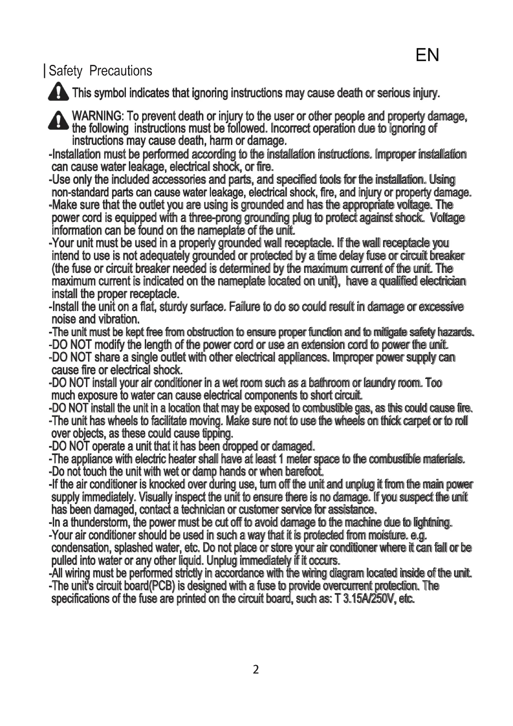 ENSafety Precautions -Installation must be performed according to the installation instructions. Improper installation can cause water leakage, electrical shock, or fire. -Use only the included accessories and parts, and specified tools for the installation. Using non-standard parts can cause water leakage, electrical shock, fire, and injury or property damage. -Make sure that the outlet you are using is grounded and has the appropriate voltage. The power cord is equipped with a three-prong grounding plug to protect against shock. Voltage information can be found on the nameplate of the unit. -Your unit must be used in a properly grounded wall receptacle. If the wall receptacle you intend to use is not adequately grounded or protected by a time delay fuse or circuit breaker (the fuse or circuit breaker needed is determined by the maximum current of the unit. The maximum current is indicated on the nameplate located on unit), have a qualified electrician install the proper receptacle. -Install the unit on a flat, sturdy surface. Failure to do so could result in damage or excessive noise and vibration.