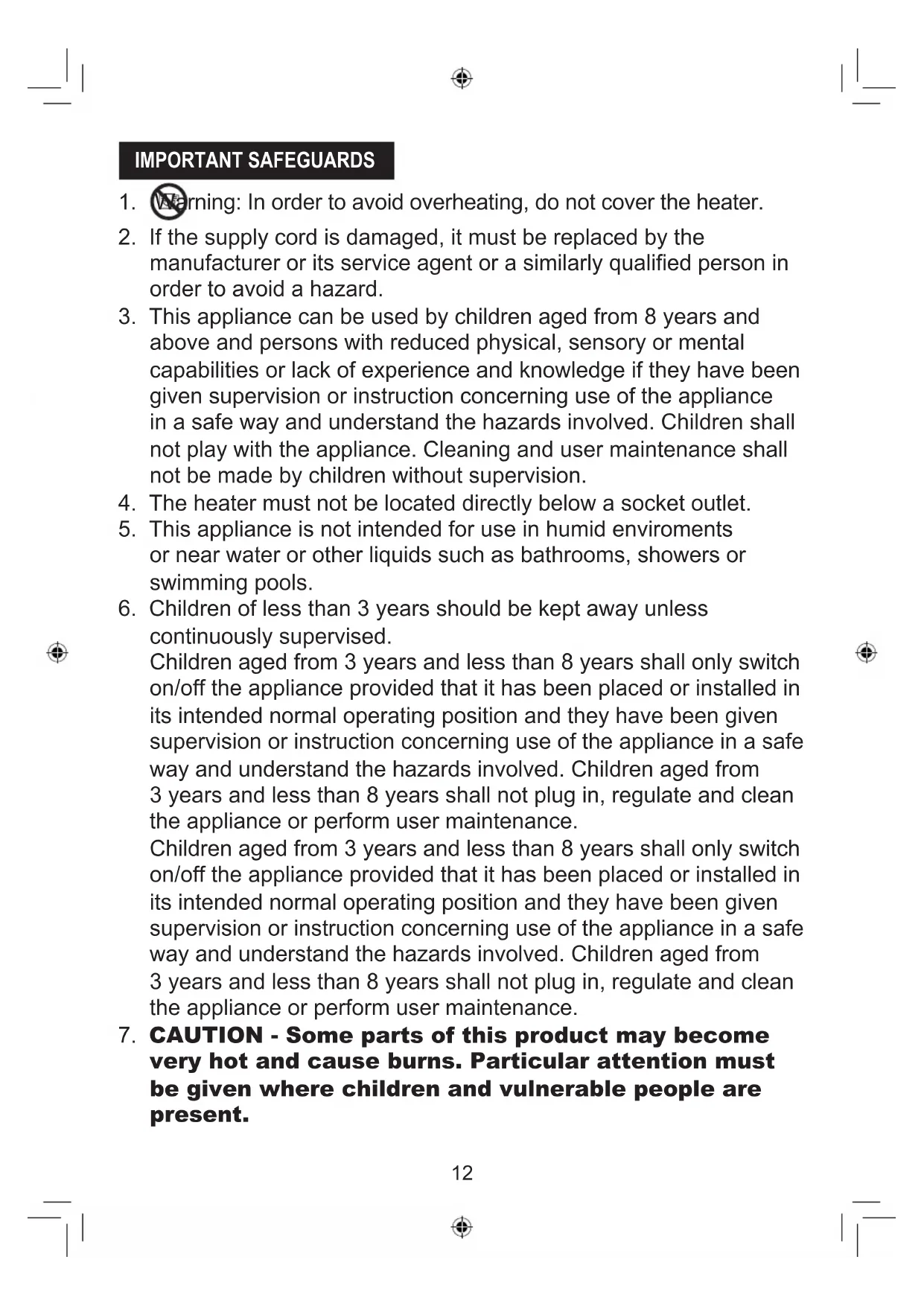 continuously supervised. Children aged from 3 years and less than 8 years shall only switch on/off the appliance provided that it has been placed or installed in its intended normal operating position and they have been given supervision or instruction concerning use of the appliance in a safe way and understand the hazards involved. Children aged from 3 years and less than 8 years shall not plug in, regulate and clean the appliance or perform user maintenance. Children aged from 3 years and less than 8 years shall only switch on/off the appliance provided that it has been placed or installed in its intended normal operating position and they have been given supervision or instruction concerning use of the appliance in a safe way and understand the hazards involved. Children aged from 3 years and less than 8 years shall not plug in, regulate and clean the appliance or perform user maintenance.