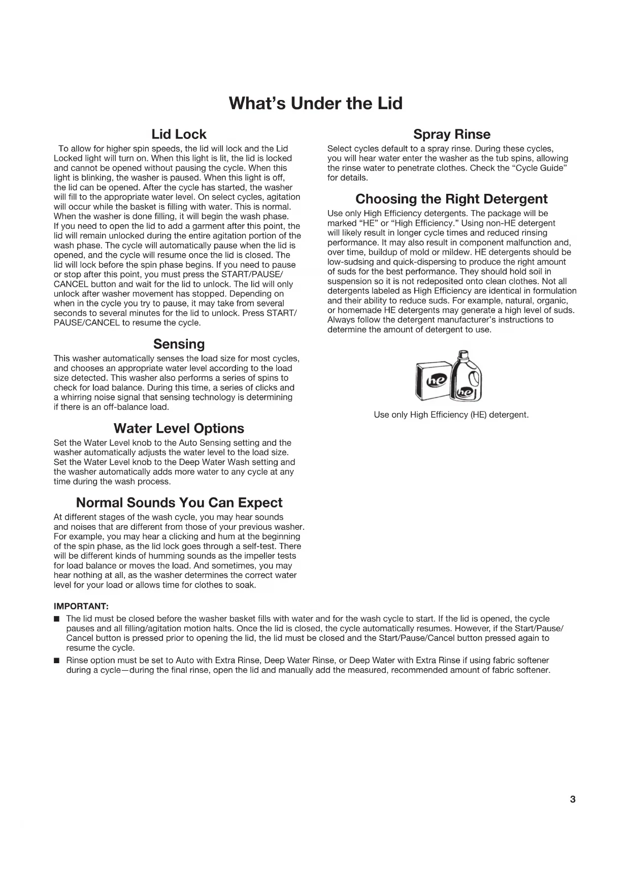 Efcient use of resources, such as energy and water.8 Add a measured amount of HE detergent or single-dose laundry packet into the basket. If using Oxi-type boosters, color-safe bleach, or fabric-softener crystals, add to the bottom of the washer basket before adding clothes. IMPORTANT: Use only High Ef ciency detergents. The package will be marked “HE” or “High Ef ciency.” Using regular detergent will likely result in longer cycle times and reduced rinsing performance. It may also result in component failures and noticeable mold or mildew. HE detergents are made to produce the right amount of suds for the best performance. NOTE: Follow the manufacturer’s instructions to determine the amount of laundry products to use.