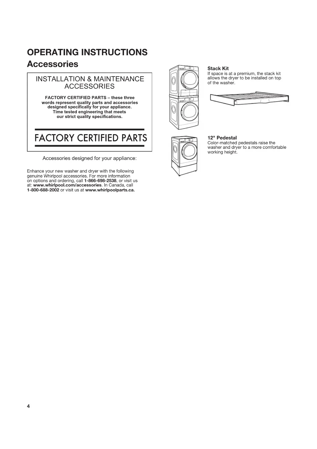 Accessories designed for your appliance: Enhance your new washer and dryer with the following genuine Whirlpool accessories. For more information on options and ordering, call 1-866-698-2538, or visit us at: www.whirlpool.com/accessories. In Canada, call 1-800-688-2002 or visit us at www.whirlpoolparts.ca. Stack Kit If space is at a premium, the stack kit allows the dryer to be installed on top of the washer. OPERATING INSTRUCTIONS 12" Pedestal Color-matched pedestals raise the washer and dryer to a more comfortable working height.5 Use Automatic Cycles for better fabric care and energy savings Use the Automatic Cycles to provide the most energy savings and enhanced fabric care from the dryer. During Automatic Cycles, condensing dryer unit temperature and moisture level are sensed in the load. This sensing occurs throughout the drying cycle and the dryer shuts off when the load reaches the selected dryness. Use the NORMAL dryness level to provide optimal energy savings. With Timed Dry, the dryer runs the amount of time set and can result in shrinkage, wrinkling, and static due to over- drying. Use Timed Dry for the occasional damp load that needs a little more drying time.