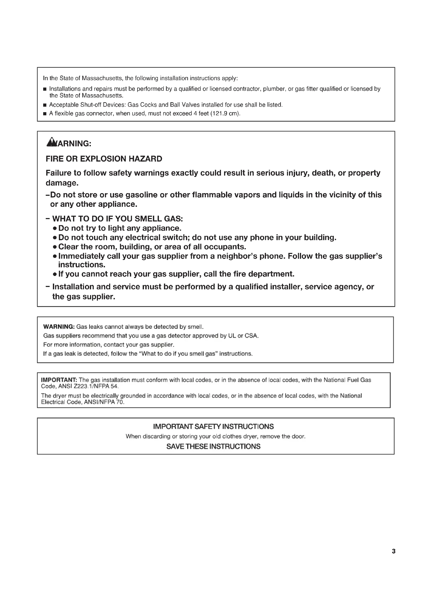 DÉPANNAGE ......................................................................................... 32 GARANTIE .............................................................................................. 36 ASSISTANCE OU SERVICE .................................Couverture arrière3 In the State of Massachusetts, the following installation instructions apply: ■ Installations and repairs must be performed by a qualified or licensed contractor, plumber, or gas fitter qualified or licensed by the State of Massachusetts. ■ Acceptable Shut-off Devices: Gas Cocks and Ball Valves installed for use shall be listed. ■ A flexible gas connector, when used, must not exceed 4 feet (121.9 cm).