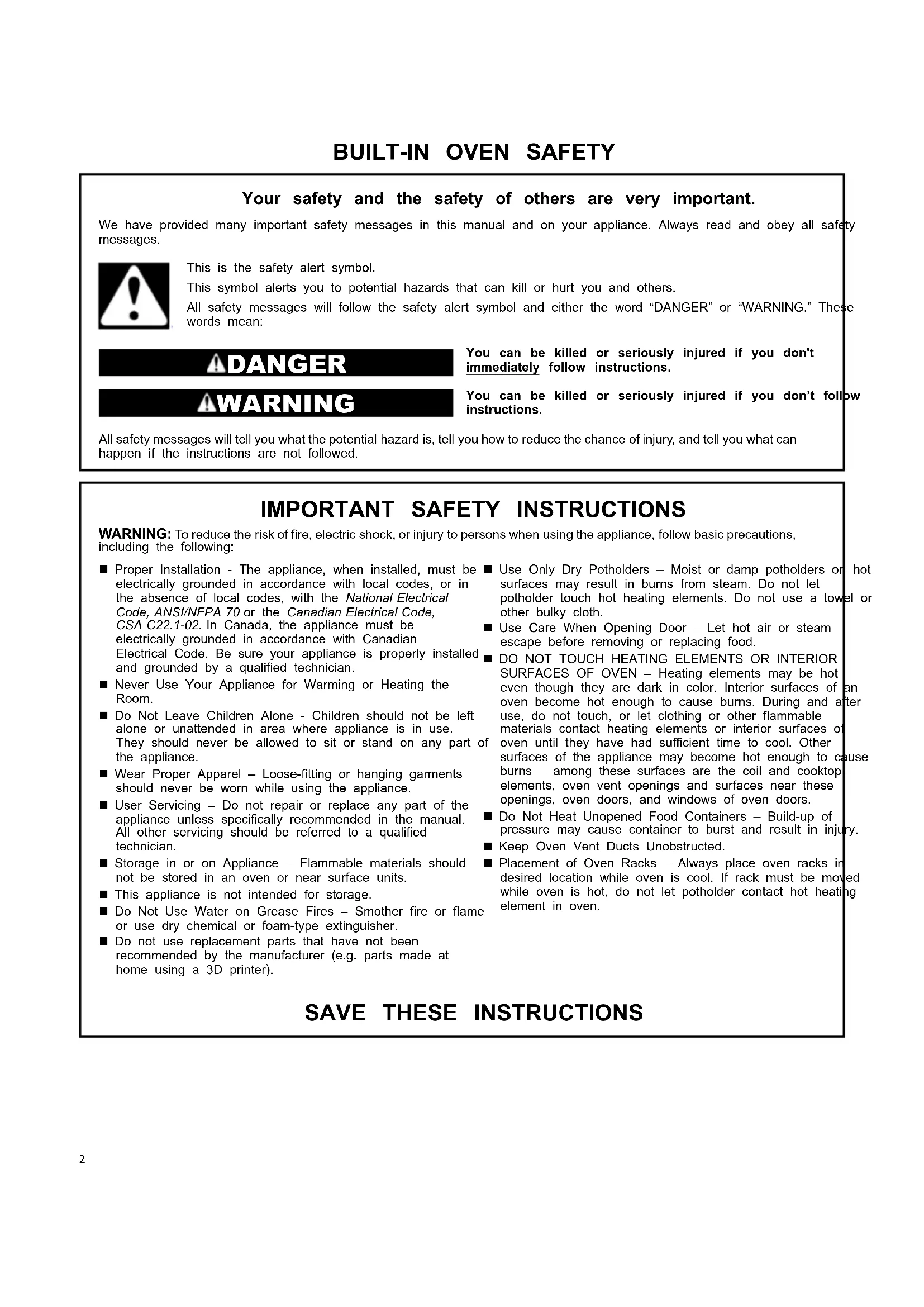 WARNING: To reduce the risk of fire, electric shock, or injury to persons when using the appliance, follow basic precautions, including the following: Proper Installation - The appliance, when installed, must be electrically grounded in accordance with local codes, or in the absence of local codes, with the National Electrical Code, ANSI/NFPA 70 or the Canadian Electrical Code, CSA C22.1-02. In Canada, the appliance must be electrically grounded in accordance with Canadian Electrical Code. Be sure your appliance is properly installed and grounded by a qualified technician. Never Use Your Appliance for Warming or Heating the Room. Do Not Leave Children Alone - Children should not be left alone or unattended in area where appliance is in use. They should never be allowed to sit or stand on any part of the appliance. Wear Proper Apparel – Loose-fitting or hanging garments should never be worn while using the appliance. User Servicing – Do not repair or replace any part of the appliance unless specifically recommended in the manual. All other servicing should be referred to a qualified technician. Storage in or on Appliance – Flammable materials should not be stored in an oven or near surface units. This appliance is not intended for storage. Do Not Use Water on Grease Fires – Smother fire or flame or use dry chemical or foam-type extinguisher. Do not use replacement parts that have not been recommended by the manufacturer (e.g. parts made at home using a 3D printer). Use Only Dry Potholders – Moist or damp potholders on hot surfaces may result in burns from steam. Do not let potholder touch hot heating elements. Do not use a towel or other bulky cloth. Use Care When Opening Door – Let hot air or steam escape before removing or replacing food. DO NOT TOUCH HEATING ELEMENTS OR INTERIOR SURFACES OF OVEN – Heating elements may be hot even though they are dark in color. Interior surfaces of an oven become hot enough to cause burns. During and after use, do not touch, or let clothing or other flammable materials contact heating elements or interior surfaces of oven until they have had sufficient time to cool. Other surfaces of the appliance may become hot enough to cause burns – among these surfaces are the coil and cooktop elements, oven vent openings and surfaces near these openings, oven doors, and windows of oven doors. Do Not Heat Unopened Food Containers – Build-up of pressure may cause container to burst and result in injury. Keep Oven Vent Ducts Unobstructed. Placement of Oven Racks – Always place oven racks in desired location while oven is cool. If rack must be moved while oven is hot, do not let potholder contact hot heating element in oven.