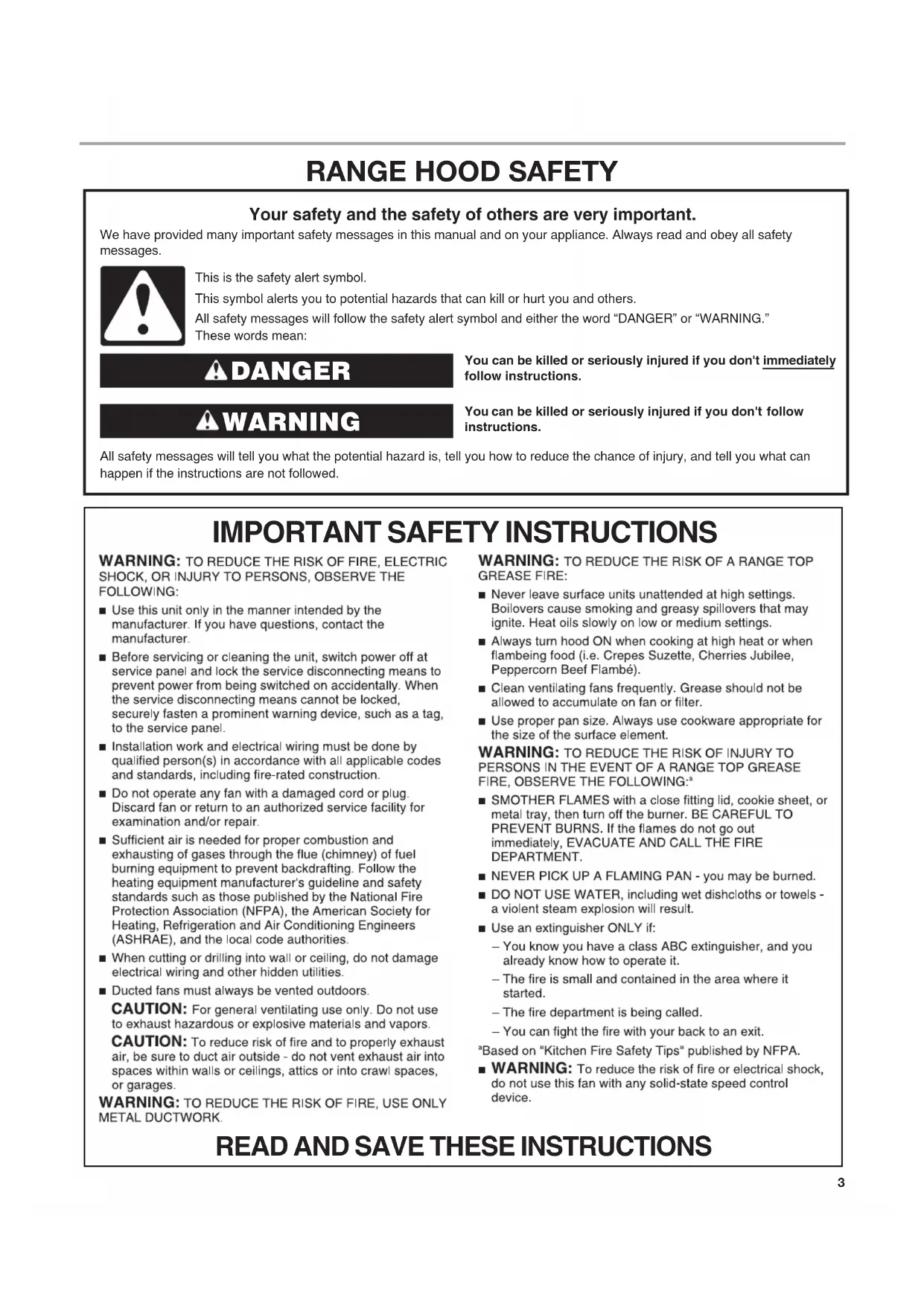 You can be killed or seriously injured if you don'tfollow All safety messages will tell you what the potential hazard is, tell you how to reduce the chance of injury, and tell you what can happen if the instructions are not followed. Your safety and the safety of others are very important. We have provided many important safety messages in this manual and on your appliance. Always read and obey all safety messages.This is the safety alert symbol.This symbol alerts you to potential hazards that can kill or hurt you and others.All safety messages will follow the safety alert symbol and either the word “DANGER” or “WARNING.”These words mean: follow instructions.instructions.