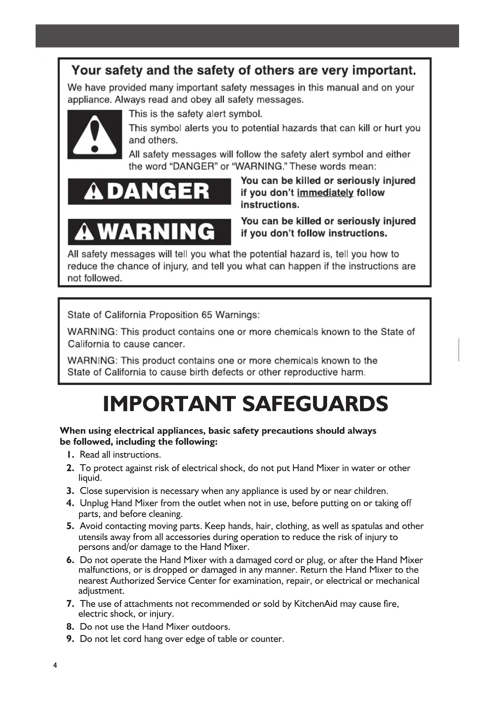 Model Number _____________________________________________________________________ Serial Number _____________________________________________________________________ Date Purchased ____________________________________________________________________ Store Name and Location ___________________________________________________________ Always keep a copy of the itemized sales receipt showing the date of purchase of your Hand Mixer. Proof of purchase will assure you of in-warranty service. Before you use your Hand Mixer, please ll out and mail your product registration card packed with the unit, or register on-line at www.kitchenaid.com. This card will enable us to contact you in the unlikely event of a product safety notication and assist us in complying with the provisions of the Consumer Product Safety Act. This card does not verify your warranty. Please complete the following for your personal records: W10434747C_FINAL.indd 3 5/12/15 1:26 PM4