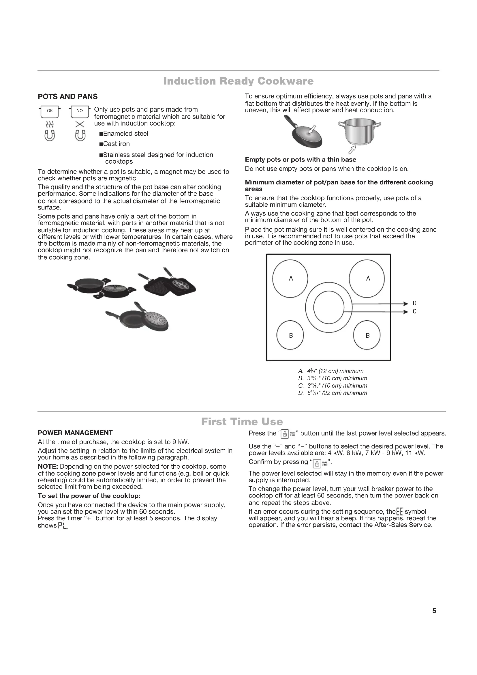 First Time Use POWER MANAGEMENTAt the time of purchase, the cooktop is set to 9 kW.Adjust the setting in relation to the limits of the electrical system in your home as described in the following paragraph.NOTE: Depending on the power selected for the cooktop, some of the cooking zone power levels and functions (e.g. boil or quick reheating) could be automatically limited, in order to prevent the selected limit from being exceeded.To set the power of the cooktop:Once you have connected the device to the main power supply, you can set the power level within 60 seconds. Press the timer “+” button for at least 5 seconds. The display shows Press the “ ” button until the last power level selected appears. Use the “+” and “−” buttons to select the desired power level. The power levels available are: 4 kW, 6 kW, 7 kW - 9kW, 11 kW.Conrm by pressing “ ”.The power level selected will stay in the memory even if the power supply is interrupted.To change the power level, turn your wall breaker power to the cooktop off for at least 60 seconds, then turn the power back on and repeat the steps above.If an error occurs during the setting sequence, the symbol will appear, and you will hear a beep. If this happens, repeat the operation. If the error persists, contact the After-Sales Service.