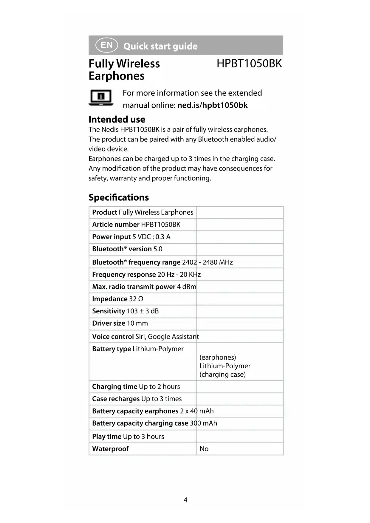 Quick start guide Fully Wireless Earphones HPBT1050BK For more information see the extended manual online: ned.is/hpbt1050bk Intended use The Nedis HPBT1050BK is a pair of fully wireless earphones. The product can be paired with any Bluetooth enabled audio/ video device. Earphones can be charged up to 3 times in the charging case. Any modication of the product may have consequences for safety, warranty and proper functioning. Specications Product Fully Wireless Earphones Article number HPBT1050BK Power input 5 VDC ; 0.3 A Bluetooth® version 5.0 Bluetooth® frequency range 2402 - 2480 MHz Frequency response 20 Hz - 20 KHz Max. radio transmit power 4 dBm Impedance 32 Ω Sensitivity 103 ± 3 dB Driver size 10 mm Voice control Siri, Google Assistant Battery type Lithium-Polymer (earphones) Lithium-Polymer (charging case) Charging time Up to 2 hours Case recharges Up to 3 times Battery capacity earphones 2 x 40 mAh Battery capacity charging case 300 mAh Play time Up to 3 hours Waterproof No5 Main parts (image A)
