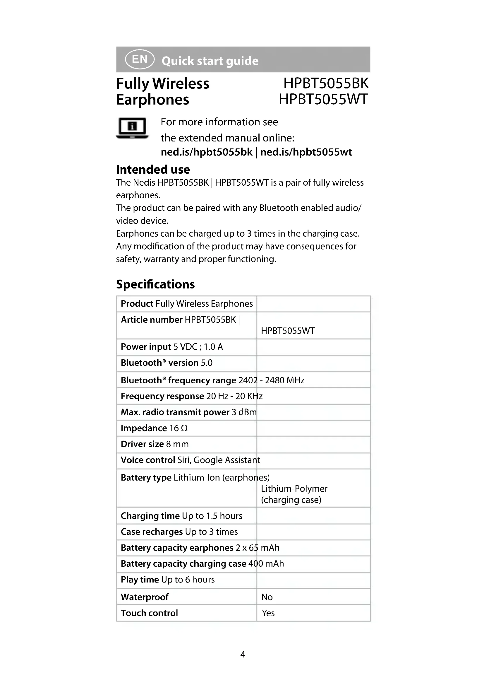 Quick start guide Fully Wireless Earphones HPBT5055BK HPBT5055WT For more information see the extended manual online: ned.is/hpbt5055bk | ned.is/hpbt5055wt Intended use The Nedis HPBT5055BK | HPBT5055WT is a pair of fully wireless earphones. The product can be paired with any Bluetooth enabled audio/ video device. Earphones can be charged up to 3 times in the charging case. Any modication of the product may have consequences for safety, warranty and proper functioning. Specications Product Fully Wireless Earphones Article number HPBT5055BK | HPBT5055WT Power input 5 VDC ; 1.0 A Bluetooth® version 5.0 Bluetooth® frequency range 2402 - 2480 MHz Frequency response 20 Hz - 20 KHz Max. radio transmit power 3 dBm Impedance 16 Ω Driver size 8 mm Voice control Siri, Google Assistant Battery type Lithium-Ion (earphones) Lithium-Polymer (charging case) Charging time Up to 1.5 hours Case recharges Up to 3 times Battery capacity earphones 2 x 65 mAh Battery capacity charging case 400 mAh Play time Up to 6 hours Waterproof No Touch control Yes5 Main parts (image A)