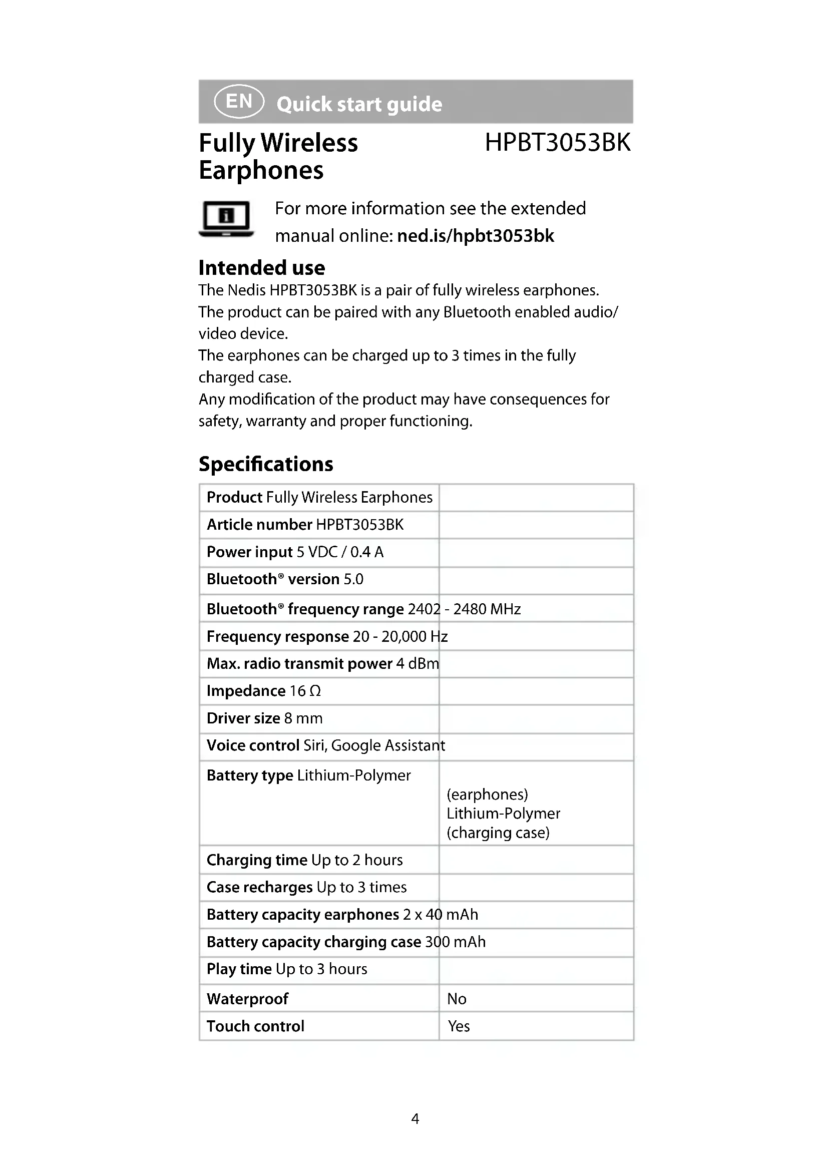 Quick start guide Fully Wireless Earphones HPBT3053BK For more information see the extended manual online: ned.is/hpbt3053bk Intended use The Nedis HPBT3053BK is a pair of fully wireless earphones. The product can be paired with any Bluetooth enabled audio/ video device. The earphones can be charged up to 3 times in the fully charged case. Any modication of the product may have consequences for safety, warranty and proper functioning. Specications Product Fully Wireless Earphones Article number HPBT3053BK Power input 5 VDC / 0.4 A Bluetooth® version 5.0 Bluetooth® frequency range 2402 - 2480 MHz Frequency response 20 - 20,000 Hz Max. radio transmit power 4 dBm Impedance 16 Ω Driver size 8 mm Voice control Siri, Google Assistant Battery type Lithium-Polymer (earphones) Lithium-Polymer (charging case) Charging time Up to 2 hours Case recharges Up to 3 times Battery capacity earphones 2 x 40 mAh Battery capacity charging case 300 mAh Play time Up to 3 hours Waterproof No Touch control Yes5 Main parts (image A)
