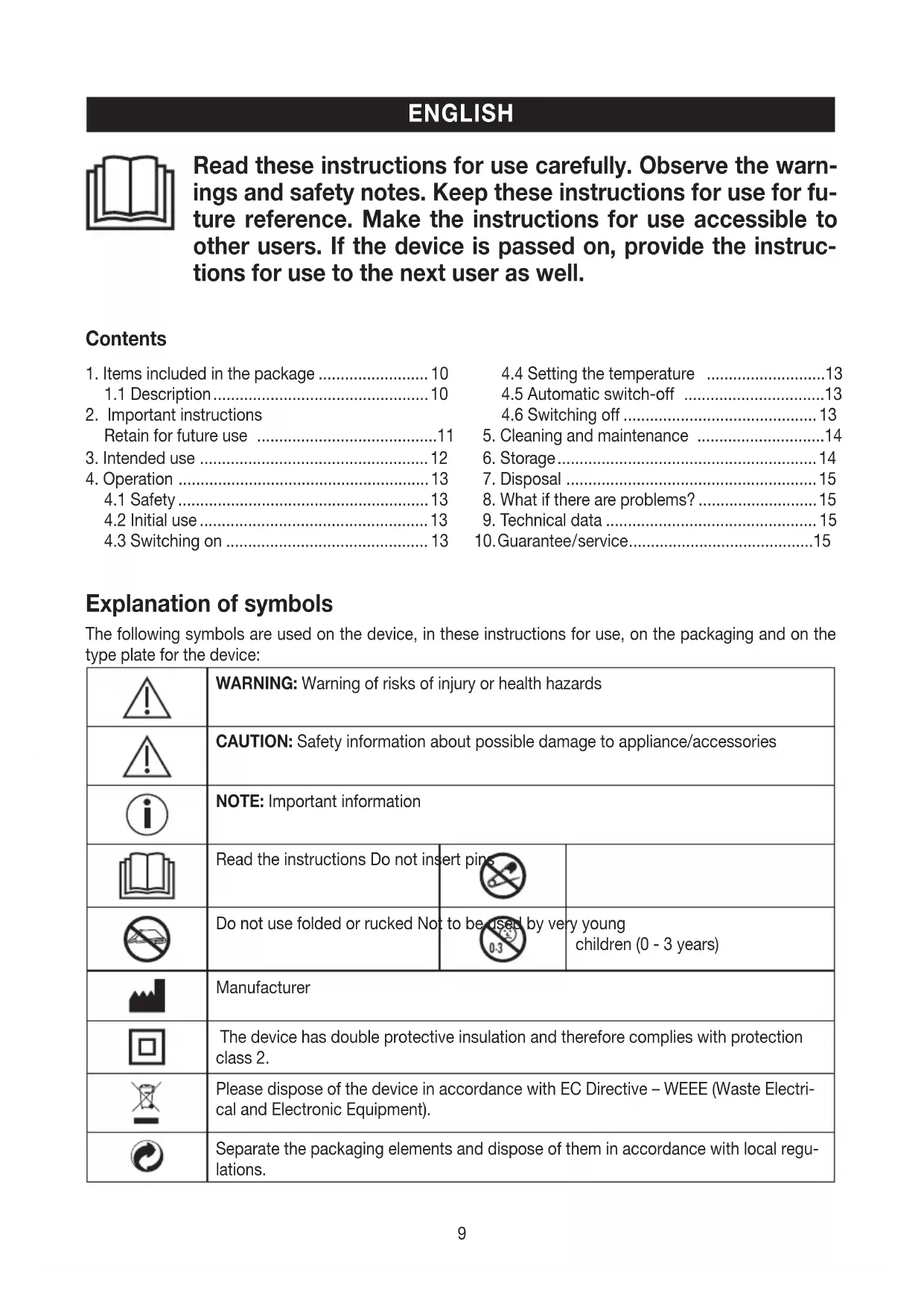 CAUTION: Safety information about possible damage to appliance/accessories NOTE: Important information Read the instructions Do not insert pins Do not use folded or rucked Not to be used by very young children (0 - 3years) Manufacturer The device has double protective insulation and therefore complies with protection class 2. Please dispose of the device in accordance with EC Directive – WEEE (Waste Electri- cal and Electronic Equipment). Separate the packaging elements and dispose of them in accordance with local regu- lations.