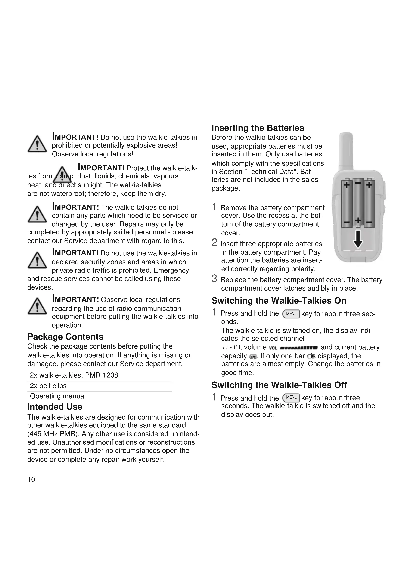3 Call signal key 8 Microphone 4 Menu key MENU 9 Loudspeaker 5 Antenna Overview of Display Symbols 10 Channel 15 VOX mode on 11 Signal being sent 16 Battery capacity indicator 12 Signal being received 17 Subcode (subchannel) 13 Call signal on 18 Volume 14 Automatic switch-off Safety Instructions Read the operating manual carefully and proceed as described Keep the operating manual close to hand for future reference Avoid any personal injury by paying attention to the following information! Warning! The walkie-talkies can be used by children from eight years of age and by persons with restricted physical, sensory or mental capabilities or a lack of experience and/or knowledge when they are under supervision or have been instructed with regard to safe use of the walkie-talkies and have understood the potential risks which result if the instructions are ignored Children may not be allowed to play with the walkie-talkies Cleaning and user maintenance may not be completed by children without any supervision Warning! Risk of suffocation! Keep away from children! Keep packaging and protective foils as well as batteries out of reach of children Keep the walkie-talkies out of reach of children Small children can swallow small parts If a battery has been swallowed, seek medical assistance immediately caution! Risk of explosion through improper replacement or removal of the batteries! Only replace the batteries with a type approved by the manufacturer and dispose of used batteries according to the applicable laws caution! Voice transmission is played through the loudspeaker Hold the walkie-talkies about 30 cm away when receiving voice transmissions This prevents any possible hearing damage10 important! Do not use the walkie-talkies in prohibited or potentially explosive areas! Observe local regulations! important! Protect the walkie-talk- ies from damp, dust, liquids, chemicals, vapours, heat and direct sunlight The walkie-talkies are not waterproof; therefore, keep them dry important! The walkie-talkies do not contain any parts which need to be serviced or changed by the user Repairs may only be completed by appropriately skilled personnel - please contact our Service department with regard to this important! Do not use the walkie-talkies in declared security zones and areas in which private radio trafc is prohibited. Emergency and rescue services cannot be called using these devices important! Observe local regulations regarding the use of radio communication equipment before putting the walkie-talkies into operation Package Contents Check the package contents before putting the walkie-talkies into operation If anything is missing or damaged, please contact our Service department 2x walkie-talkies, PMR 1208 2x belt clips Operating manual Intended Use The walkie-talkies are designed for communication with other walkie-talkies equipped to the same standard (446 MHz PMR) Any other use is considered unintend- ed use. Unauthorised modications or reconstructions are not permitted Under no circumstances open the device or complete any repair work yourself Inserting the Batteries Before the walkie-talkies can be used, appropriate batteries must be inserted in them Only use batteries which comply with the specications in Section "Technical Data" Bat- teries are not included in the sales package 1 Remove the battery compartment cover Use the recess at the bot- tom of the battery compartment cover 2 Insert three appropriate batteries in the battery compartment Pay attention the batteries are insert- ed correctly regarding polarity 3 Replace the battery compartment cover The battery compartment cover latches audibly in place Switching the Walkie-Talkies On 1 Press and hold the MENU key for about three sec- onds The walkie-talkie is switched on, the display indi- cates the selected channel