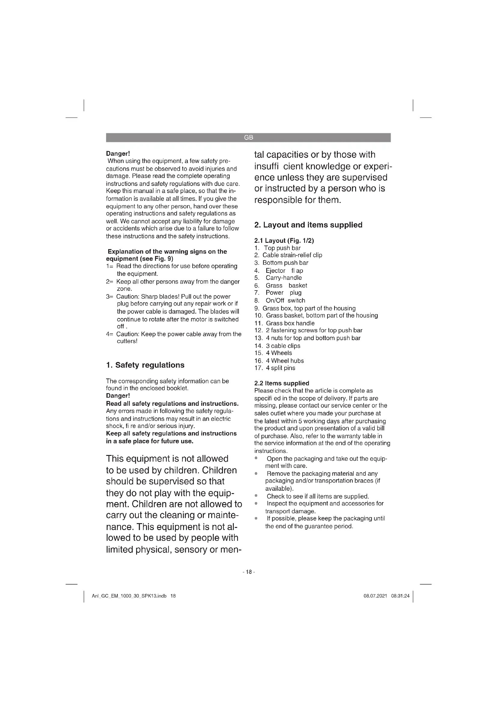Danger! When using the equipment, a few safety pre- cautions must be observed to avoid injuries and damage. Please read the complete operating instructions and safety regulations with due care. Keep this manual in a safe place, so that the in- formation is available at all times. If you give the equipment to any other person, hand over these operating instructions and safety regulations as well. We cannot accept any liability for damage or accidents which arise due to a failure to follow these instructions and the safety instructions. Explanation of the warning signs on the equipment (see Fig. 9) 1= Read the directions for use before operating the equipment. 2= Keep all other persons away from the danger zone. 3= Caution: Sharp blades! Pull out the power plug before carrying out any repair work or if the power cable is damaged. The blades will continue to rotate after the motor is switched off . 4= Caution: Keep the power cable away from the cutters!