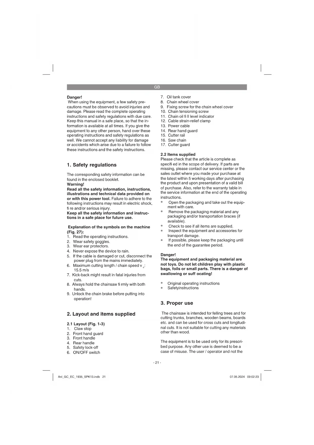 The chainsaw is intended for felling trees and for cutting trunks, branches, wooden beams, boards etc. and can be used for cross cuts and longitudi- nal cuts. It is not suitable for cutting any materials other than wood. The equipment is to be used only for its prescri- bed purpose. Any other use is deemed to be a case of misuse. The user / operator and not the Anl_GC_EC_1935_SPK13.indb 21Anl_GC_EC_1935_SPK13.indb 21 07.05.2024 09:02:2307.05.2024 09:02:23GB