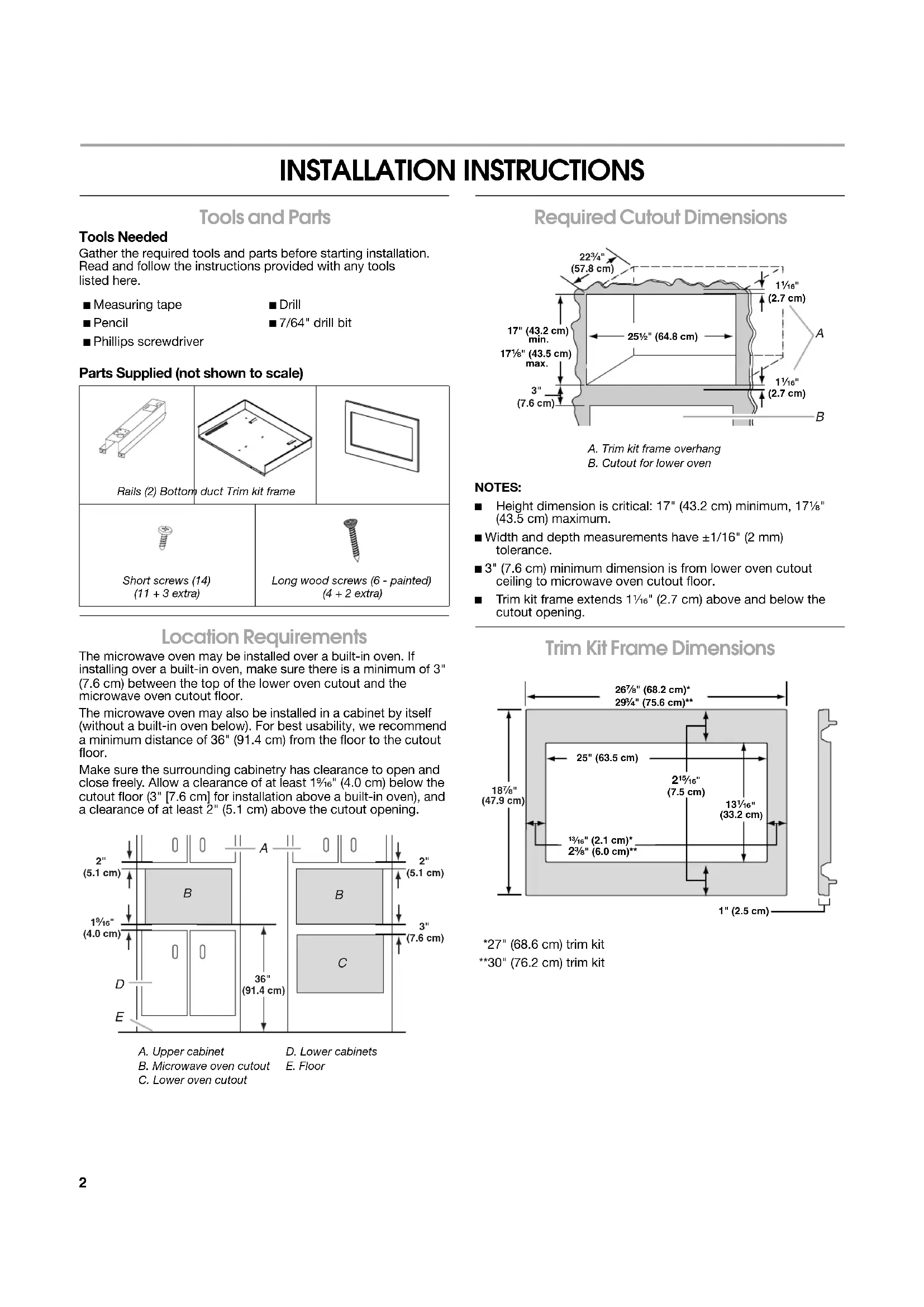 - Installation du cadre de la trousse de garniture W10434148A You can be killed or seriously injured if you don't immediately You can be killed or seriously injured if you don'tfollow All safety messages will tell you what the potential hazard is, tell you how to reduce the chance of injury, and tell you what can happen if the instructions are not followed. Your safety and the safety of others are very important. We have provided many important safety messages in this manual and on your appliance. Always read and obey all safety messages.This is the safety alert symbol.This symbol alerts you to potential hazards that can kill or hurt you and others.All safety messages will follow the safety alert symbol and either the word “DANGER” or “WARNING.”These words mean:follow instructions.instructions. DANGER WARNING2 INSTALLATION INSTRUCTIONS Tools and Parts Tools Needed Gather the required tools and parts before starting installation. Read and follow the instructions provided with any tools listed here. Parts Supplied (not shown to scale) Location Requirements The microwave oven may be installed over a built-in oven. If installing over a built-in oven, make sure there is a minimum of 3" (7.6 cm) between the top of the lower oven cutout and the microwave oven cutout floor. The microwave oven may also be installed in a cabinet by itself (without a built-in oven below). For best usability, we recommend a minimum distance of 36" (91.4 cm) from the floor to the cutout floor. Make sure the surrounding cabinetry has clearance to open and close freely. Allow a clearance of at least 1⁹⁄₁₆" (4.0 cm) below the cutout floor (3" [7.6 cm] for installation above a built-in oven), and a clearance of at least 2" (5.1 cm) above the cutout opening. Required Cutout Dimensions NOTES: ■ Height dimension is critical: 17" (43.2 cm) minimum, 17¹⁄₈" (43.5 cm) maximum. ■ Width and depth measurements have ±1/16" (2 mm) tolerance. ■ 3" (7.6 cm) minimum dimension is from lower oven cutout ceiling to microwave oven cutout floor. ■ Trim kit frame extends 1¹⁄₁₆" (2.7 cm) above and below the cutout opening. Trim Kit Frame Dimensions *27" (68.6 cm) trim kit **30" (76.2 cm) trim kit ■ Measuring tape■ Pencil■ Phillips screwdriver■ Drill■ 7/64" drill bitRails (2) Bottom duct Trim kit frameShort screws (14)(11 + 3 extra)Long wood screws (6 - painted)(4 + 2 extra)A. Upper cabinetB. Microwave oven cutoutC. Lower oven cutoutD. Lower cabinetsE. Floor 3"(7.6 cm) p. 11