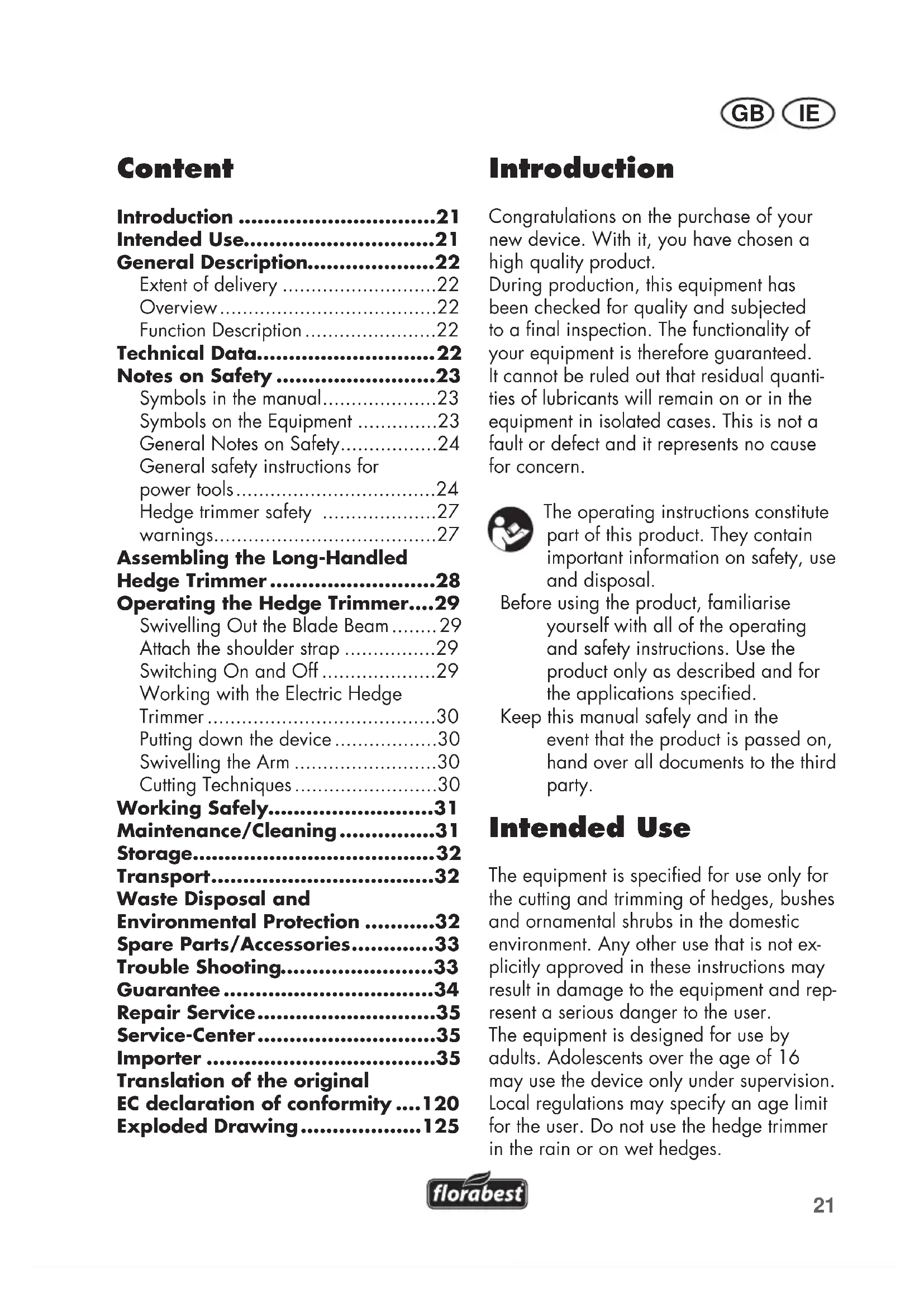 Introduction Congratulations on the purchase of your new device. With it, you have chosen a high quality product. During production, this equipment has been checked for quality and subjected to a nal inspection. The functionality of your equipment is therefore guaranteed. It cannot be ruled out that residual quanti- ties of lubricants will remain on or in the equipment in isolated cases. This is not a fault or defect and it represents no cause for concern. The operating instructions constitute part of this product. They contain important information on safety, use and disposal. Before using the product, familiarise yourself with all of the operating and safety instructions. Use the product only as described and for the applications specied. Keep this manual safely and in the event that the product is passed on, hand over all documents to the third party. Intended Use The equipment is specied for use only for the cutting and trimming of hedges, bushes and ornamental shrubs in the domestic environment. Any other use that is not ex- plicitly approved in these instructions may result in damage to the equipment and rep- resent a serious danger to the user. The equipment is designed for use by adults. Adolescents over the age of 16 may use the device only under supervision. Local regulations may specify an age limit for the user. Do not use the hedge trimmer in the rain or on wet hedges. Translation of the original EC declaration of conformity