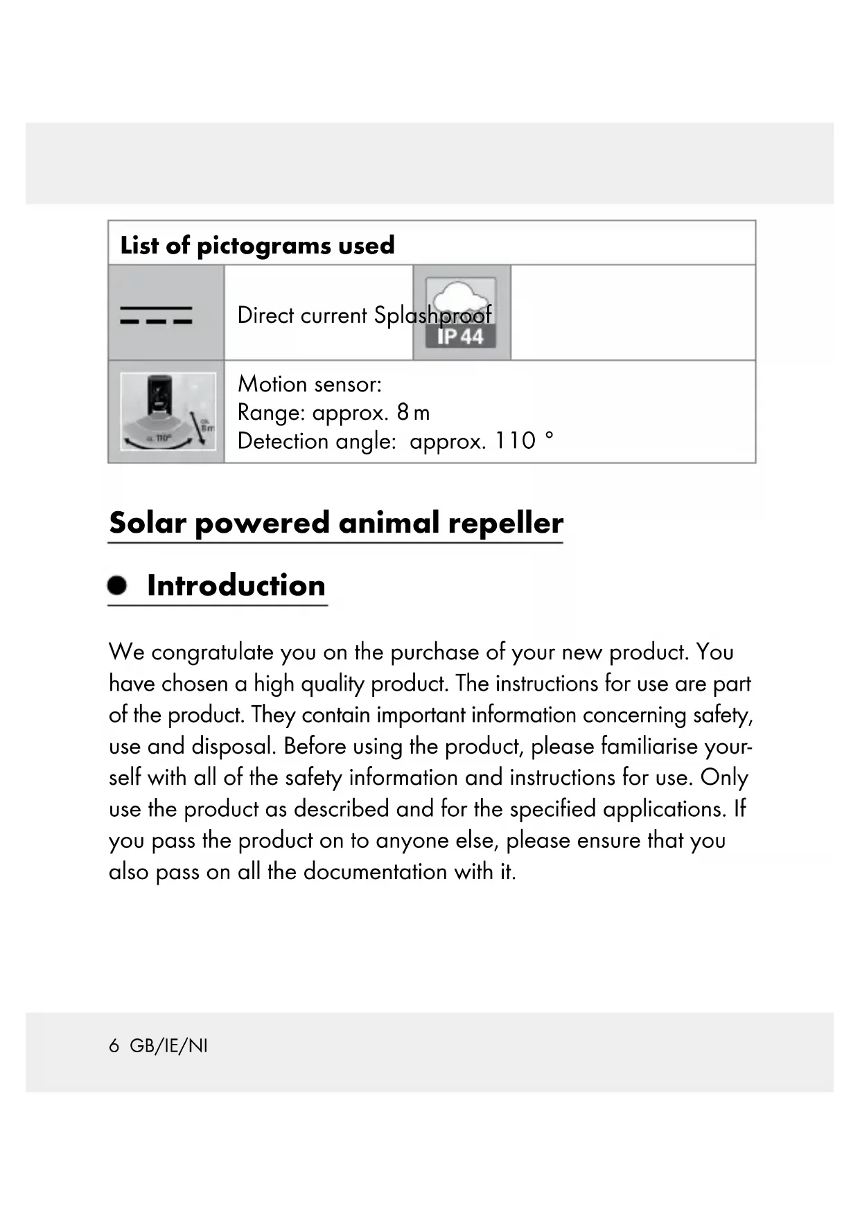 15 145 GB/IE/NI List of pictograms used .......................................................Page 6 Introduction ................................................................................Page 6 Intended use ..................................................................................Page 7 Mechanism ....................................................................................Page 7 Description of parts .......................................................................Page 8 Scope of delivery ...........................................................................Page 8 Technical data ...............................................................................Page 9 Safety instructions .................................................................. Page 9 Safety instructions for batteries / rechargeable batteries ............ Page 11 Before use .................................................................................... Page 13 Replacing / inserting rechargeable batteries ...............................Page 13 Charging the rechargeable batteries ...........................................Page 14 Start-up ..........................................................................................Page 16 Installation on the ground, using the ground spike .....................Page 16 Installation on a wall using a screw / peg ...................................Page 17 Operation.....................................................................................Page 17 Adjusting the motion sensor ..........................................................Page 17 Adjusting the signal frequency ......................................................Page 18 Maintenance and cleaning ...............................................Page 18 Troubleshooting ....................................................................... Page 19 Disposal ......................................................................................... Page 19 Warranty ...................................................................................... Page 216 GB/IE/NI List of pictograms used Direct current Splashproof Motion sensor: Range: approx. 8 m Detection angle: approx. 110 ° Solar powered animal repeller Introduction We congratulate you on the purchase of your new product. You have chosen a high quality product. The instructions for use are part of the product. They contain important information concerning safety, use and disposal. Before using the product, please familiarise your- self with all of the safety information and instructions for use. Only use the product as described and for the specified applications. If you pass the product on to anyone else, please ensure that you also pass on all the documentation with it.7 GB/IE/NI Intended use This product is intended for use as an animal repellant, through the use of high frequency tones and / or flashing light. Animals, which are under species protection, e.g. the mole, must not be caught, injured or killed. Any use of the product for other or additional purposes is considered improper use. No claims can be made for problems cause by improper use or failure to comply with the op- erational and safety instructions included in the operational manual. The product is not intended for commercial use. Mechanism The product registers the body heat of animals that move in the detection range of the motion sensor. As soon as an animal is registered, the product produces high frequency tones, which are uncomfortable for animals. As different animals can have different hearing ranges, the frequency of the signal can be adjusted. Noc- turnal animals can also trigger an automatic flashing light. To be able to repel lots of different animals, you can adjust the settings to combine any of the signal frequencies with the flashing light.