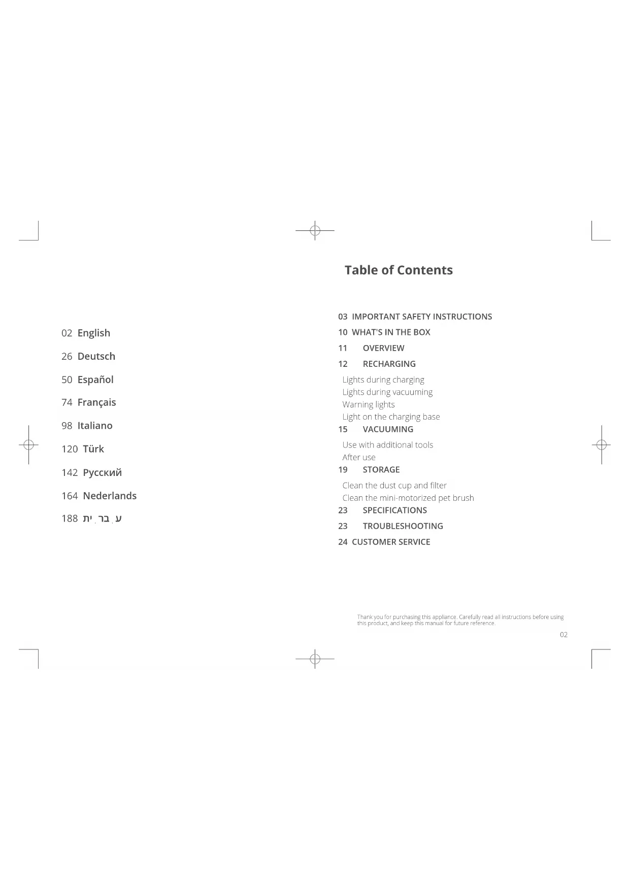 11 OVERVIEW 12 RECHARGING Lights during charging Lights during vacuuming Warning lights Light on the charging base 15 VACUUMING Use with additional tools After use 19 STORAGE Clean the dust cup and filter Clean the mini-motorized pet brush 23 SPECIFICATIONS 23 TROUBLESHOOTING 24 CUSTOMER SERVICE 02 English 26 Deutsch 50 Español 74 Français 98 Italiano 120 Türk 142 Pусский 164 Nederlands 188 תי ִרב ִע03