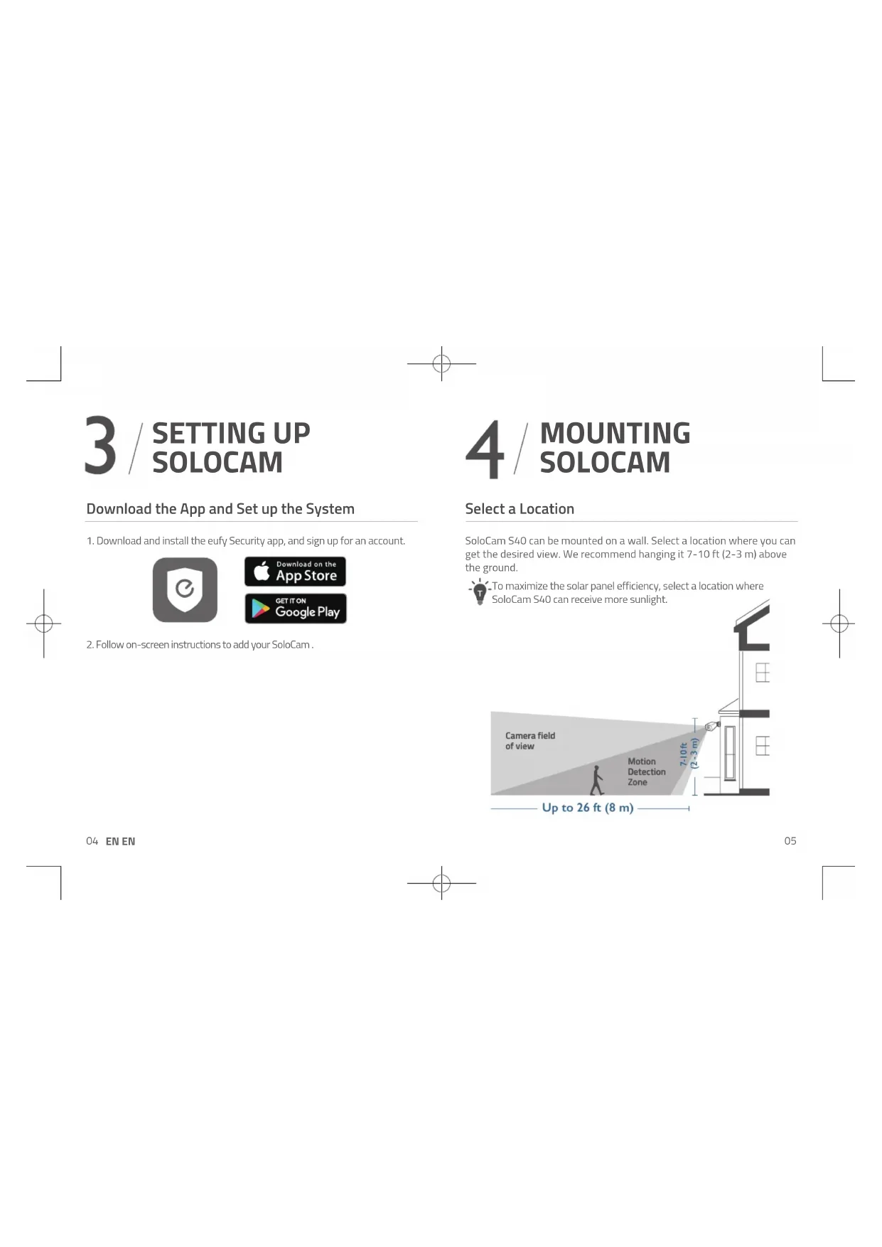 MOUNTING SOLOCAM Select a Location SoloCam S40 can be mounted on a wall. Select a location where you can get the desired view. We recommend hanging it 7-10 ft (2-3 m) above the ground. Motion Detection Zone Camera field of view Up to 26 ft (8 m) 7-10 ft (2 - 3 m) Motion Detection Zone Camera field of view To maximize the solar panel efficiency, select a location where SoloCam S40 can receive more sunlight.06 EN EN