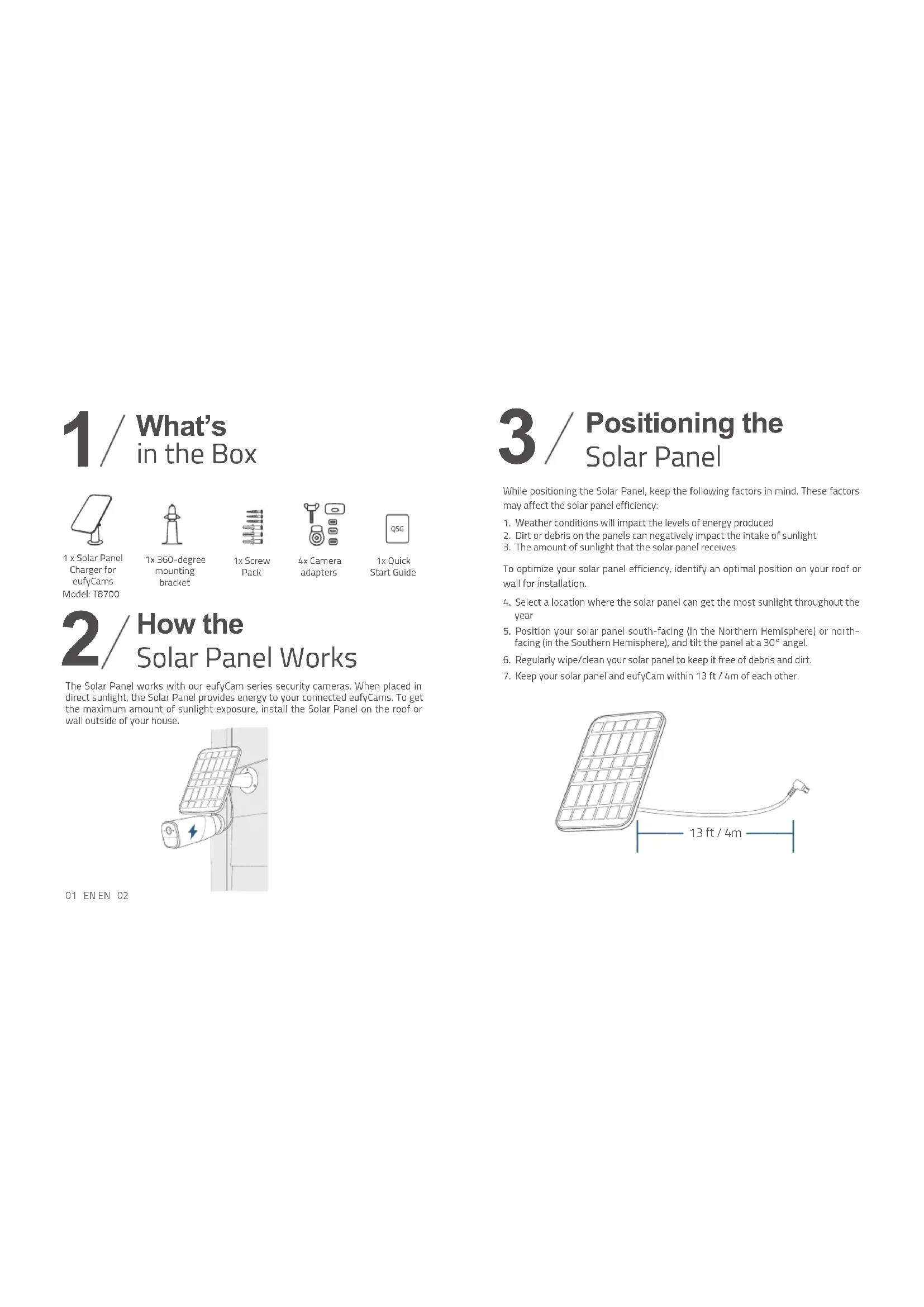1 x Solar Panel Charger for eufyCamsModel: T87001x 360-degree mounting bracket The Solar Panel works with our eufyCam series security cameras. When placed in direct sunlight, the Solar Panel provides energy to your connected eufyCams. To get the maximum amount of sunlight exposure, install the Solar Panel on the roof or wall outside of your house. 1x Screw Pack 4x Cameraadapters1x QuickStart Guide03 EN EN 04 Installing the Solar Panel