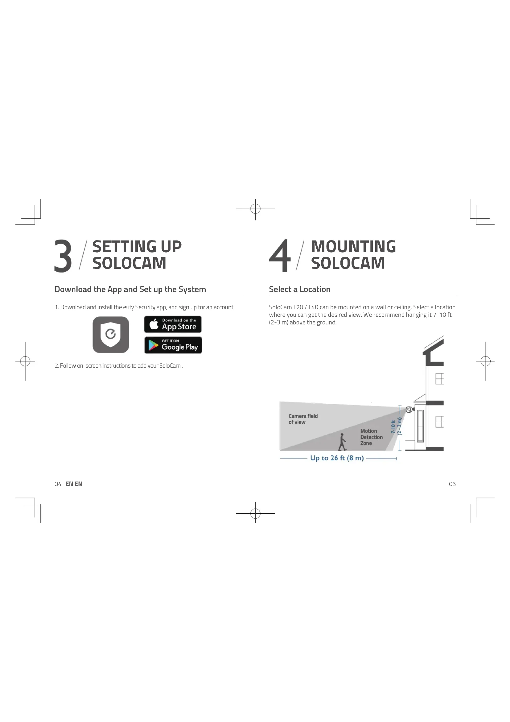 MOUNTING SOLOCAM Select a Location SoloCam L20 / L40 can be mounted on a wall or ceiling. Select a location where you can get the desired view. We recommend hanging it 7-10 ft (2-3 m) above the ground. Motion Detection Zone Camera field of view Up to 26 ft (8 m) 7-10 ft (2 - 3 m) Motion Detection Zone Camera field of view SETTING UP SOLOCAM Download the App and Set up the System