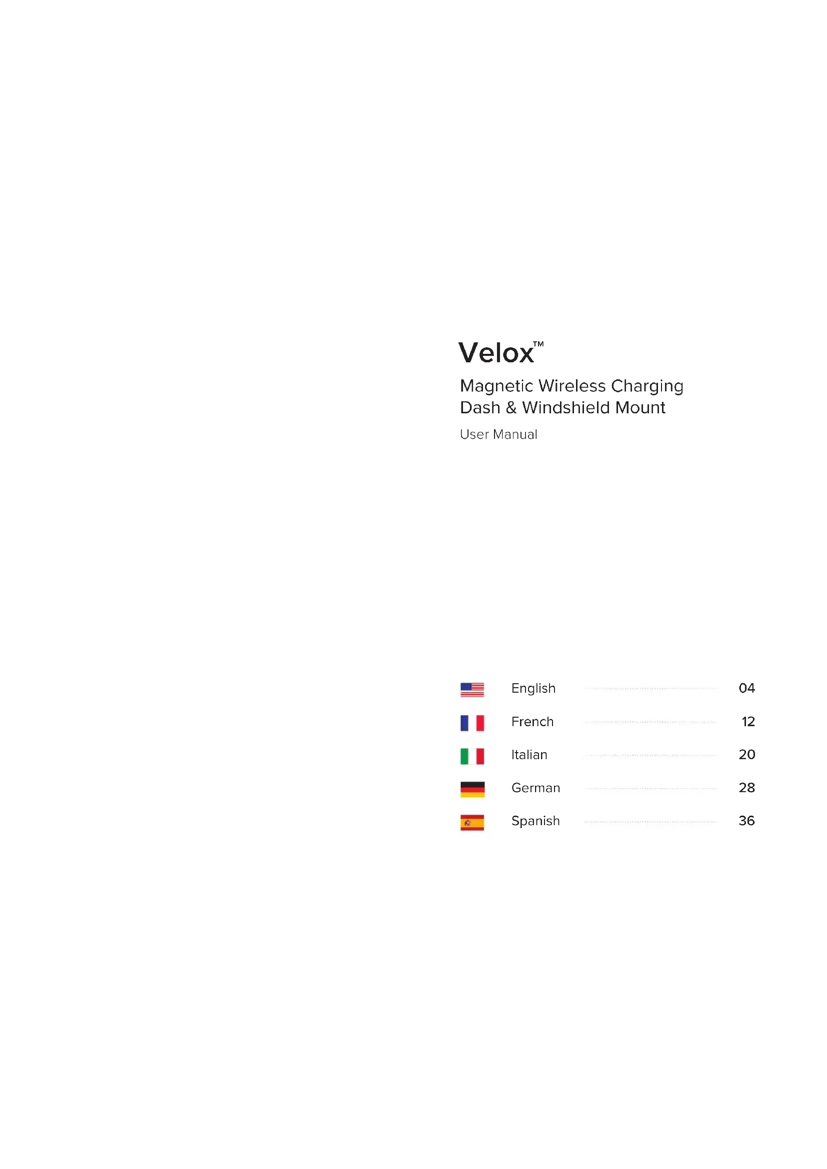 Index For optimal mounting and charging, please follow the detailed instructions within this manual when using the Velox Magnetic Wireless Charging Dash & Windshield Mount. 01 Product Information Magnetic Mounting FaceLeverSuction Cup Built-in USB-C CableDashboard PadPivot Knob 12V Power AdapterRotating Ball JointTelescopic Arm At a Glance76 EN Device Compatibility Velox products are designed for use with MagSafe compatible iPhones and cases. Compatible devices include the iPhone 13, iPhone 13 mini, iPhone 13 Pro, iPhone 13 Pro Max, and the iPhone 12 series. iPhone 13 Pro Max & 13 Pro iPhone 13 & 13 Mini Input Output DC 12V ~ 24V DC 5V ~ 3A DC 9V ~ 2A DC 12V ~ 1.5A Product Specifications Power Adapter Specifications Item Specification Total Input DC 9.0V-1.67A DC 5.0V-2.0A Wireless Charger Output