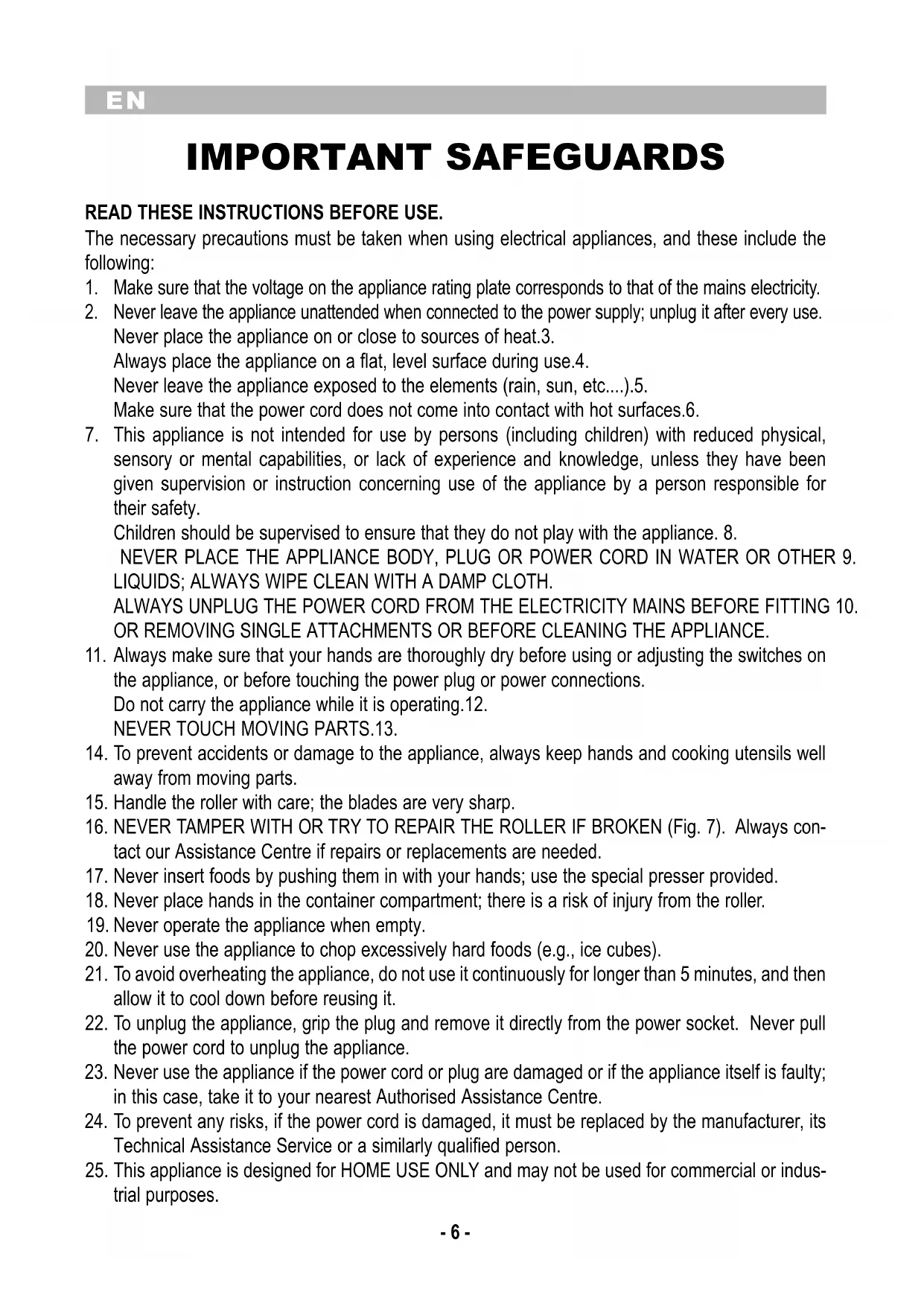IMPORTANT SAFEGUARDS READ THESE INSTRUCTIONS BEFORE USE. The necessary precautions must be taken when using electrical appliances, and these include the following: Make sure that the voltage on the appliance rating plate corresponds to that of the mains electricity.1. Never leave the appliance unattended when connected to the power supply; unplug it after every use.2. Never place the appliance on or close to sources of heat.3. Always place the appliance on a flat, level surface during use.4. Never leave the appliance exposed to the elements (rain, sun, etc....).5. Make sure that the power cord does not come into contact with hot surfaces.6. This appliance is not intended for use by persons (including children) with reduced physical, 7. sensory or mental capabilities, or lack of experience and knowledge, unless they have been given supervision or instruction concerning use of the appliance by a person responsible for their safety. Children should be supervised to ensure that they do not play with the appliance. 8. NEVER PLACE THE APPLIANCE BODY, PLUG OR POWER CORD IN WATER OR OTHER 9. LIQUIDS; ALWAYS WIPE CLEAN WITH A DAMP CLOTH. ALWAYS UNPLUG THE POWER CORD FROM THE ELECTRICITY MAINS BEFORE FITTING 10. OR REMOVING SINGLE ATTACHMENTS OR BEFORE CLEANING THE APPLIANCE. Always make sure that your hands are thoroughly dry before using or adjusting the switches on 11. the appliance, or before touching the power plug or power connections. Do not carry the appliance while it is operating.12. NEVER TOUCH MOVING PARTS.13. To prevent accidents or damage to the appliance, always keep hands and cooking utensils well 14. away from moving parts. Handle the roller with care; the blades are very sharp.15. NEVER TAMPER WITH OR TRY TO REPAIR THE ROLLER IF BROKEN (Fig. 7). Always con-16. tact our Assistance Centre if repairs or replacements are needed. Never insert foods by pushing them in with your hands; use the special presser provided.17. Never place hands in the container compartment; there is a risk of injury from the roller.18. Never operate the appliance when empty.19. Never use the appliance to chop excessively hard foods (e.g., ice cubes).20. To avoid overheating the appliance, do not use it continuously for longer than 5 minutes, and then 21. allow it to cool down before reusing it. To unplug the appliance, grip the plug and remove it directly from the power socket. Never pull 22. the power cord to unplug the appliance. Never use the appliance if the power cord or plug are damaged or if the appliance itself is faulty; 23. in this case, take it to your nearest Authorised Assistance Centre. To prevent any risks, if the power cord is damaged, it must be replaced by the manufacturer, its 24. Technical Assistance Service or a similarly qualified person. This appliance is designed for HOME USE ONLY and may not be used for commercial or indus-25. trial purposes.EN