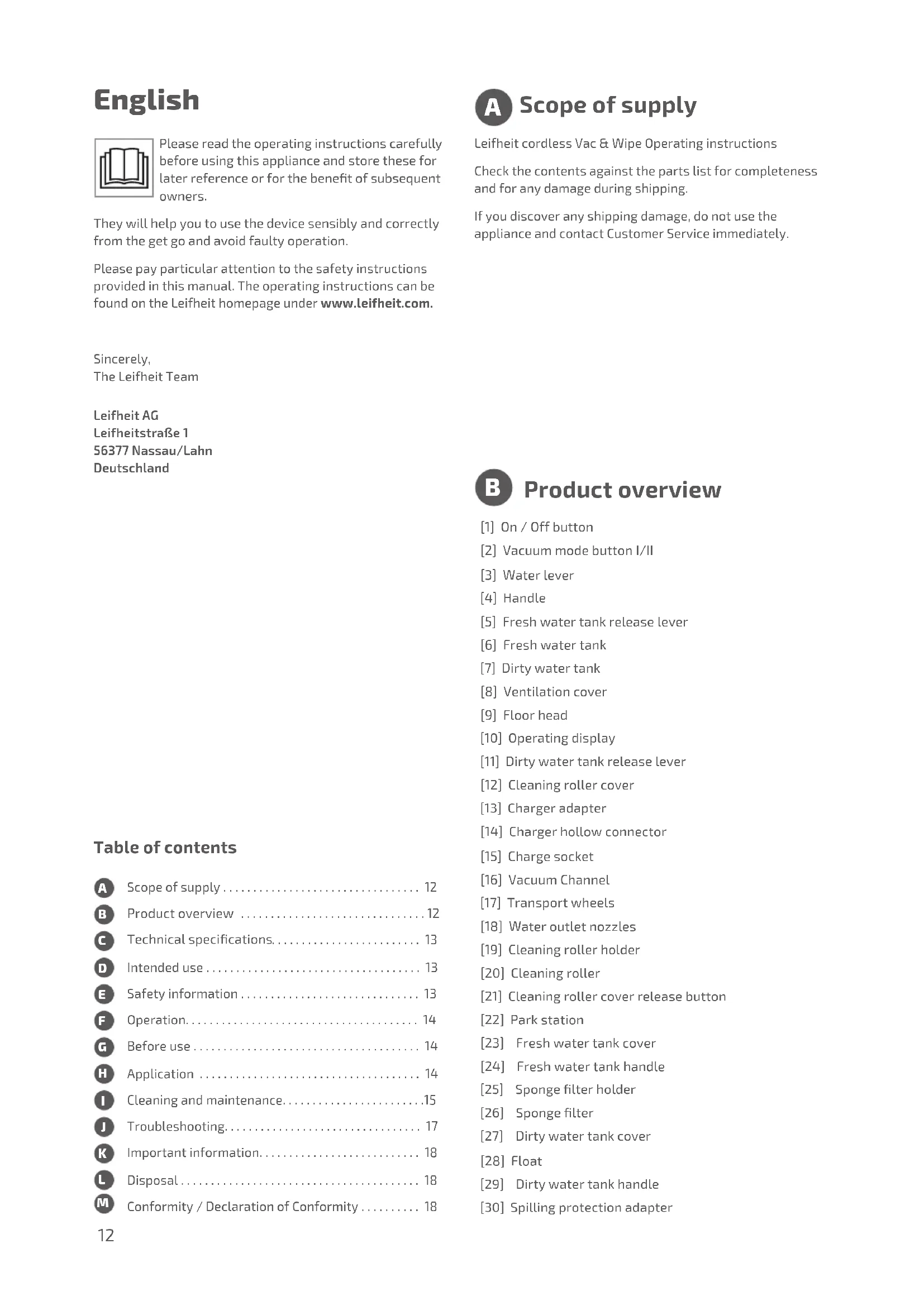 Scope of supply Leifheit cordless Vac & Wipe Operating instructionsCheck the contents against the parts list for completeness and for any damage during shipping. If you discover any shipping damage, do not use the appliance and contact Customer Service immediately. [1] On / Off button [2] Vacuum mode button I/II [3] Water lever [4] Handle [5] Fresh water tank release lever [6] Fresh water tank [7] Dirty water tank [8] Ventilation cover [9] Floor head [10] Operating display [11] Dirty water tank release lever [12] Cleaning roller cover [13] Charger adapter [14] Charger hollow connector [15] Charge socket [16] Vacuum Channel [17] Transport wheels [18] Water outlet nozzles [19] Cleaning roller holder [20] Cleaning roller [21] Cleaning roller cover release button [22] Park station [23] Fresh water tank cover [24] Fresh water tank handle [25] Sponge lter holder [26] Sponge lter [27] Dirty water tank cover [28] Float [29] Dirty water tank handle [30] Spilling protection adapter Product overview