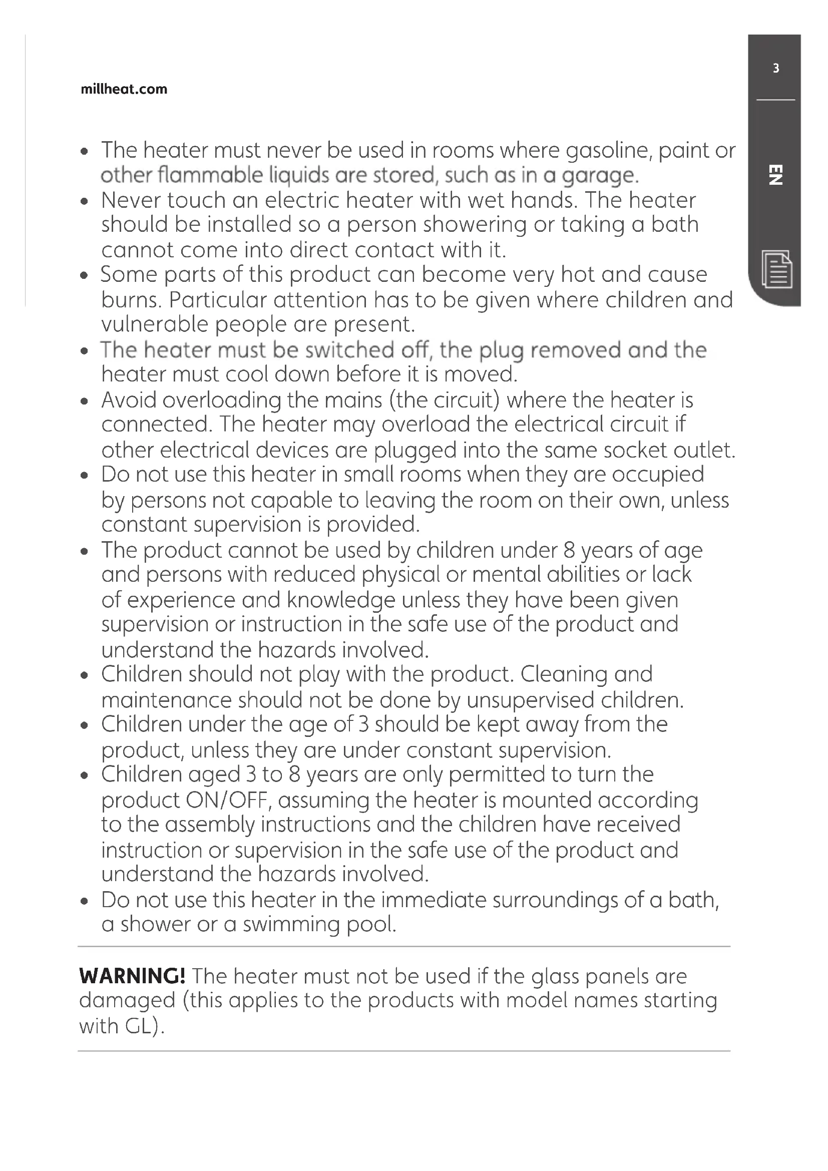millheat.comWARNING! The heater must not be used if the glass panels are damaged (this applies to the products with model names starting with GL).