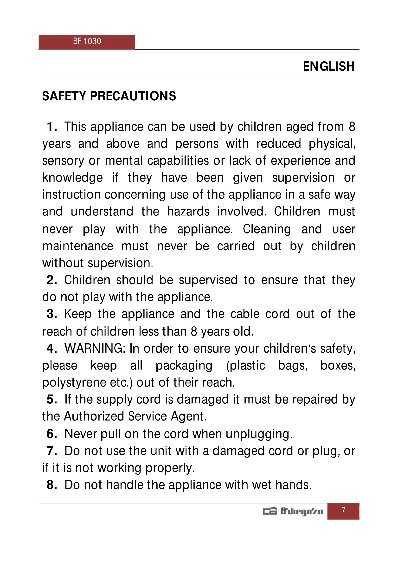 8. Do not handle the appliance with wet hands.BF 1030