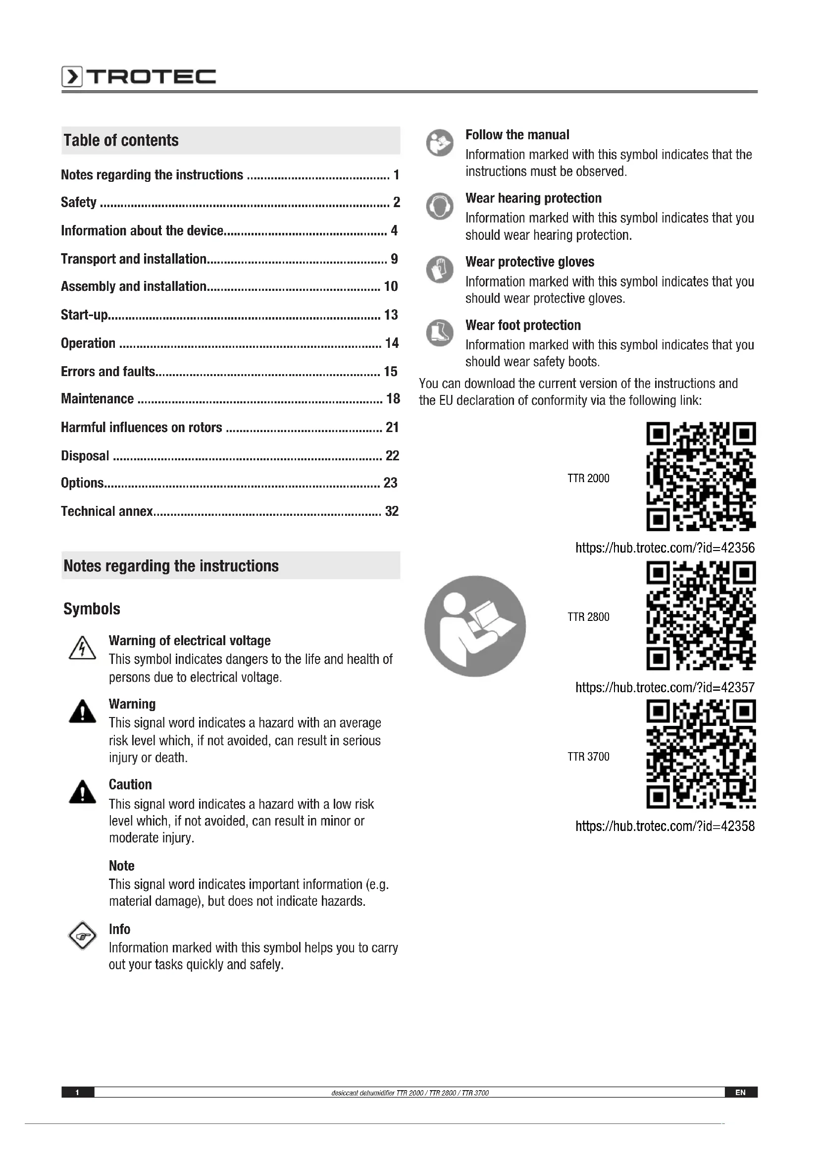 - Technical annex Notes regarding the instructions Symbols Warning of electrical voltage This symbol indicates dangers to the life and health of persons due to electrical voltage. Warning This signal word indicates a hazard with an average risk level which, if not avoided, can result in serious injury or death. Caution This signal word indicates a hazard with a low risk level which, if not avoided, can result in minor or moderate injury. Note This signal word indicates important information (e.g. material damage), but does not indicate hazards. Info Information marked with this symbol helps you to carry out your tasks quickly and safely. Follow the manual Information marked with this symbol indicates that the instructions must be observed. Wear hearing protection Information marked with this symbol indicates that you should wear hearing protection. Wear protective gloves Information marked with this symbol indicates that you should wear protective gloves. Wear foot protection Information marked with this symbol indicates that you should wear safety boots. You can download the current version of the instructions and the EUdeclaration of conformity via the following link: TTR 2000 https://hub.trotec.com/?id=42356 TTR 2800 https://hub.trotec.com/?id=42357 TTR 3700 https://hub.trotec.com/?id=42358EN 2 desiccant dehumidifier TTR 2000 / TTR 2800 / TTR 3700 Safety Read this manual carefully before starting or using the device. Always store the manual in the immediate vicinity of the device or its site of use! Warning Read all safety warnings and all instructions. Failure to follow the warnings and instructions may result in electric shock, fire and/ or serious injury. Save all warnings and instructions for future reference. p. 32