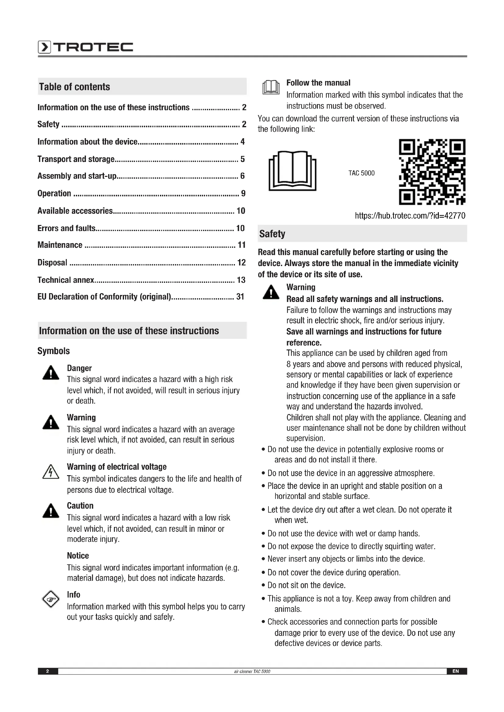 - EU Declaration of Conformity (original) Information on the use of these instructions Symbols Danger This signal word indicates a hazard with a high risk level which, if not avoided, will result in serious injury or death. Warning This signal word indicates a hazard with an average risk level which, if not avoided, can result in serious injury or death. Warning of electrical voltage This symbol indicates dangers to the life and health of persons due to electrical voltage. Caution This signal word indicates a hazard with a low risk level which, if not avoided, can result in minor or moderate injury. Notice This signal word indicates important information (e.g. material damage), but does not indicate hazards. Info Information marked with this symbol helps you to carry out your tasks quickly and safely. Follow the manual Information marked with this symbol indicates that the instructions must be observed. You can download the current version of these instructions via the following link: TAC 5000 https://hub.trotec.com/?id=42770 Safety Read this manual carefully before starting or using the device. Always store the manual in the immediate vicinity of the device or its site of use. Warning Read all safety warnings and all instructions. Failure to follow the warnings and instructions may result in electric shock, fire and/or serious injury. Save all warnings and instructions for future reference. This appliance can be used by children aged from 8years and above and persons with reduced physical, sensory or mental capabilities or lack of experience and knowledge if they have been given supervision or instruction concerning use of the appliance in a safe way and understand the hazards involved. Children shall not play with the appliance. Cleaning and user maintenance shall not be done by children without supervision. p. 31