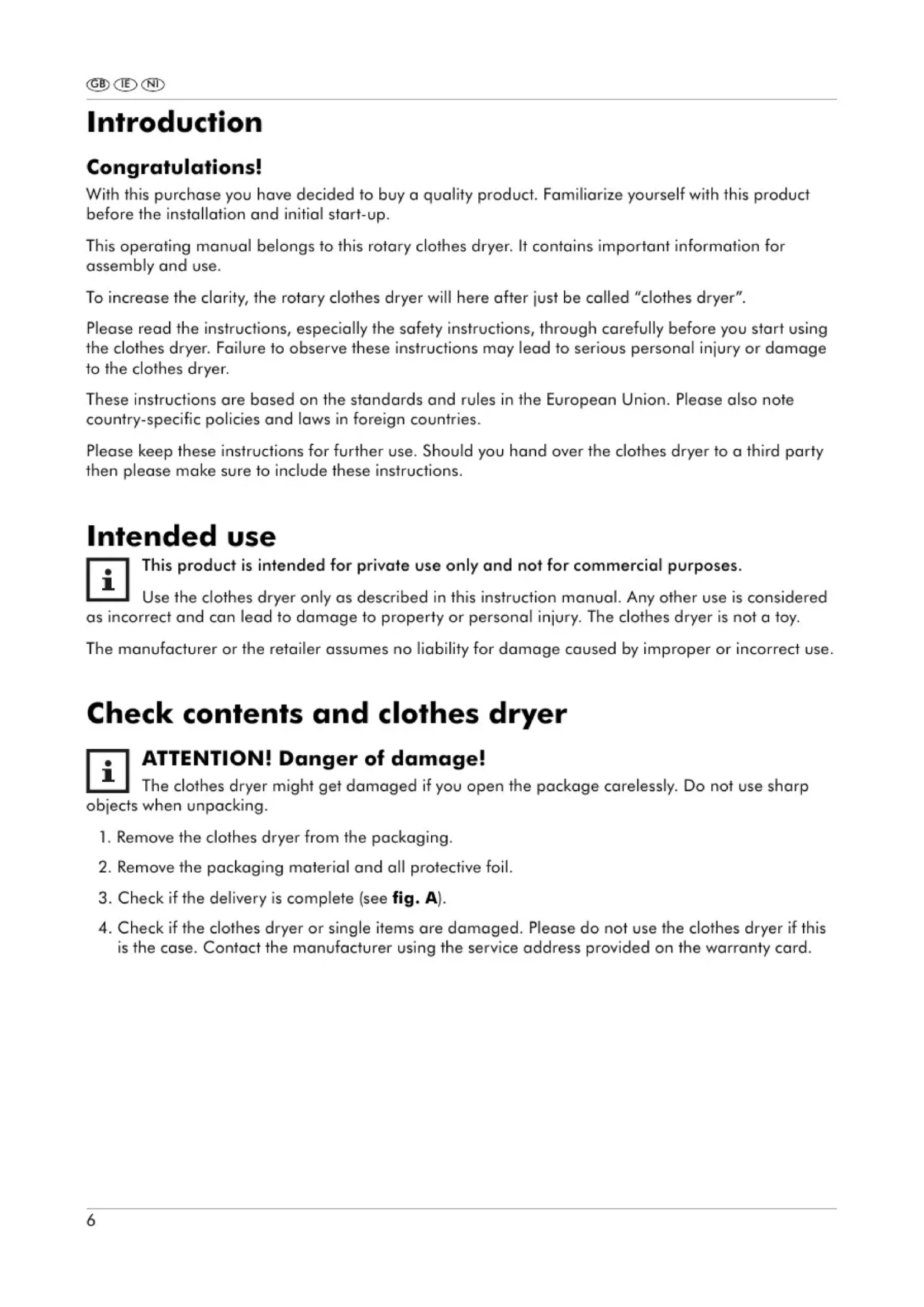This product is intended for private use only and not for commercial purposes. Use the clothes dryer only as described in this instruction manual. Any other use is considered as incorrect and can lead to damage to property or personal injury. The clothes dryer is not a toy. The manufacturer or the retailer assumes no liability for damage caused by improper or incorrect use. Check contents and clothes dryer