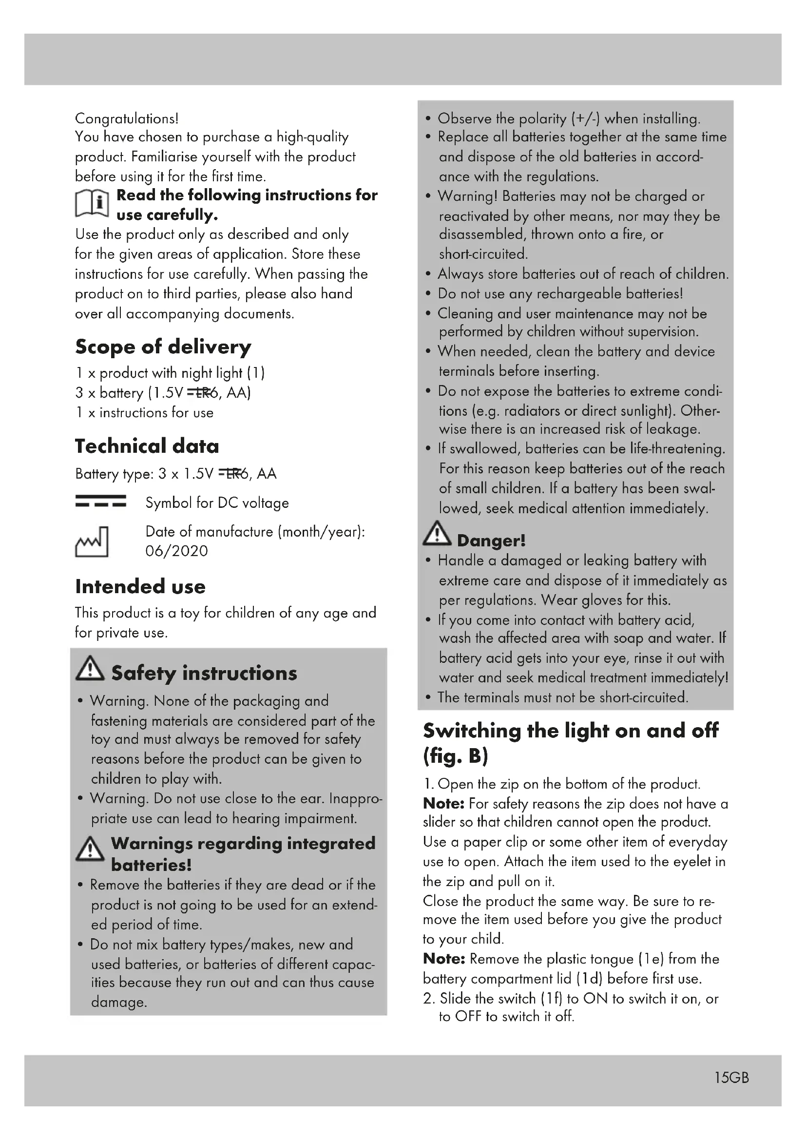 Note: For safety reasons the zip does not have a slider so that children cannot open the product. Use a paper clip or some other item of everyday use to open. Attach the item used to the eyelet in the zip and pull on it. Close the product the same way. Be sure to re- move the item used before you give the product to your child. Note: Remove the plastic tongue (1e) from the battery compartment lid (1d) before first use.