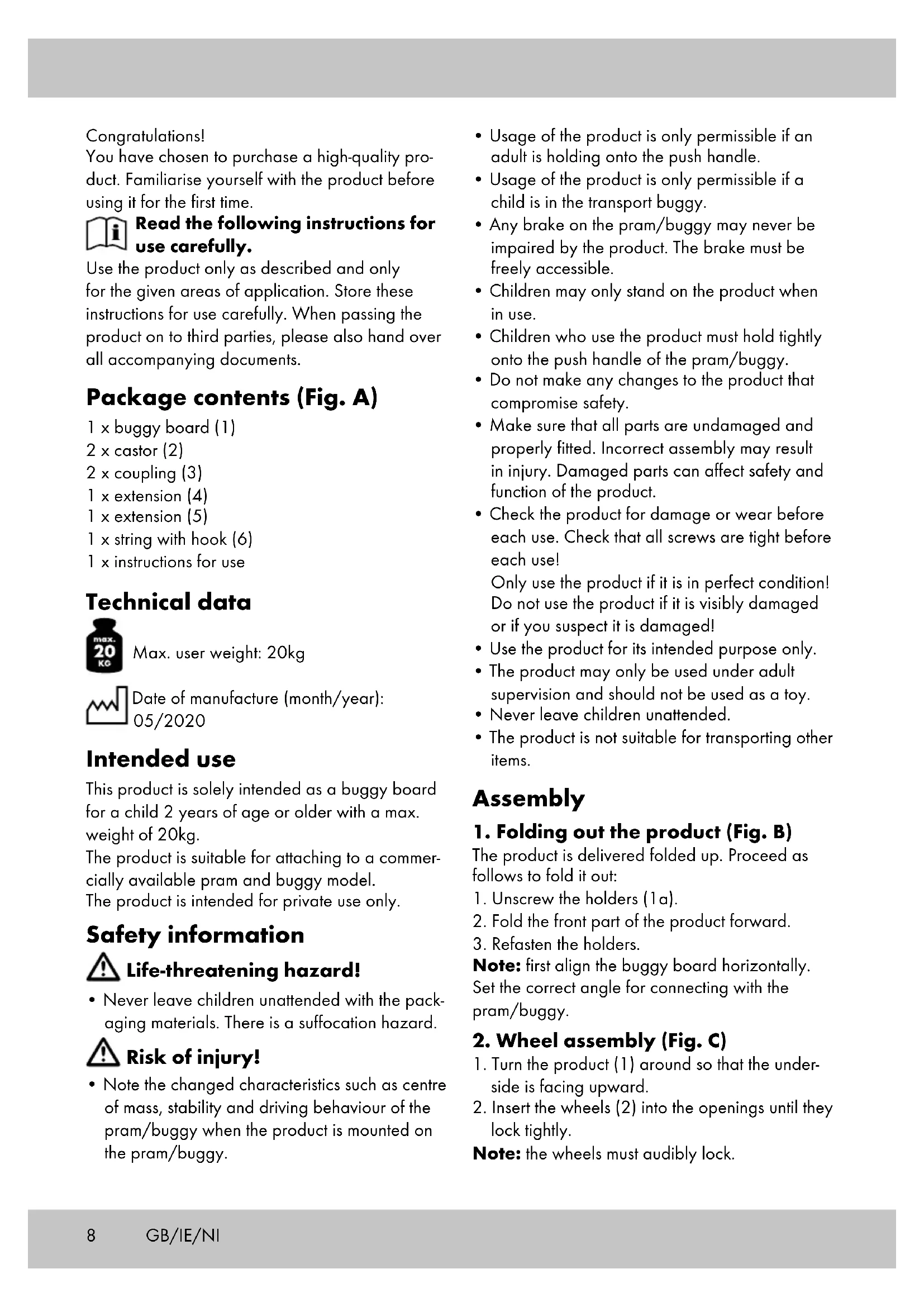lock tightly. Note: the wheels must audibly lock. Congratulations! You have chosen to purchase a high-quality pro- duct. Familiarise yourself with the product before using it for the first time. Read the following instructions for use carefully. Use the product only as described and only for the given areas of application. Store these instructions for use carefully. When passing the product on to third parties, please also hand over all accompanying documents. Package contents (Fig. A) 1 x buggy board (1) 2 x castor (2) 2 x coupling (3) 1 x extension (4) 1 x extension (5) 1 x string with hook (6) 1 x instructions for use Technical data Max. user weight: 20kg Date of manufacture (month/year): 05/2020 Intended use This product is solely intended as a buggy board for a child 2 years of age or older with a max. weight of 20kg. The product is suitable for attaching to a commer- cially available pram and buggy model. The product is intended for private use only. Safety information Life-threatening hazard!