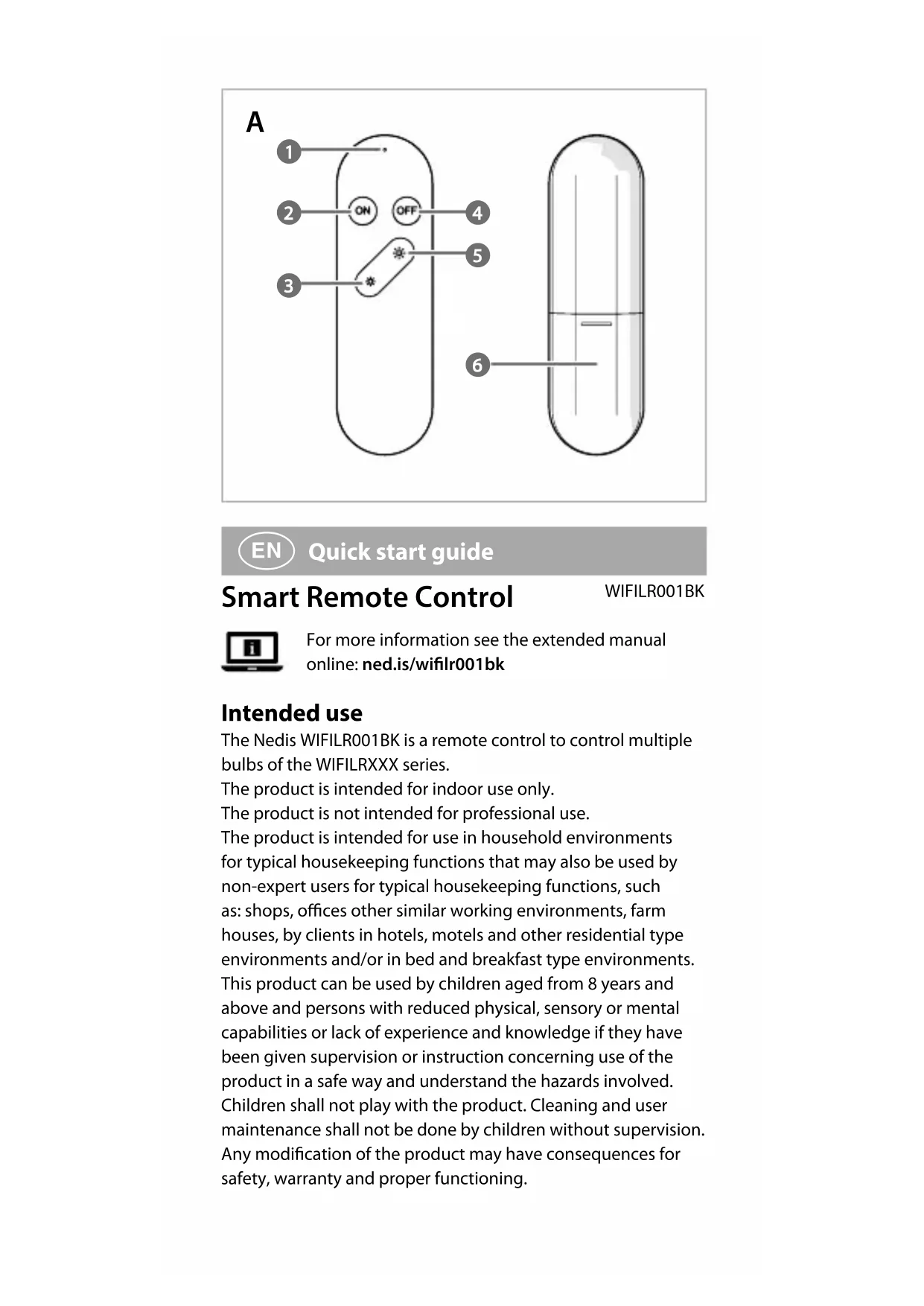 Quick start guide Smart Remote Control WIFILR001BK For more information see the extended manual online: ned.is/wilr001bk Intended use The Nedis WIFILR001BK is a remote control to control multiple bulbs of the WIFILRXXX series. The product is intended for indoor use only. The product is not intended for professional use. The product is intended for use in household environments for typical housekeeping functions that may also be used by non-expert users for typical housekeeping functions, such as: shops, oces other similar working environments, farm houses, by clients in hotels, motels and other residential type environments and/or in bed and breakfast type environments. This product can be used by children aged from 8 years and above and persons with reduced physical, sensory or mental capabilities or lack of experience and knowledge if they have been given supervision or instruction concerning use of the product in a safe way and understand the hazards involved. Children shall not play with the product. Cleaning and user maintenance shall not be done by children without supervision. Any modication of the product may have consequences for safety, warranty and proper functioning.4 Specications Product Smart Remote Control Article number WIFILR001BK Dimensions (l x w x h) 130 x 28 x 14 mm Power input 3 VDC ; < 0.2 A Operating temperature -20 °C - 40 °C Operating humidity Up to 60% Frequency range 2412 - 2484 MHz Maximum transmit power 16 dBm Battery 2x AAA Main parts (image A) 1 Indicator LED 2 On button 3 Decrease brightness 4 O button 5 Increase brightness 6 Battery compartment Safety instructions