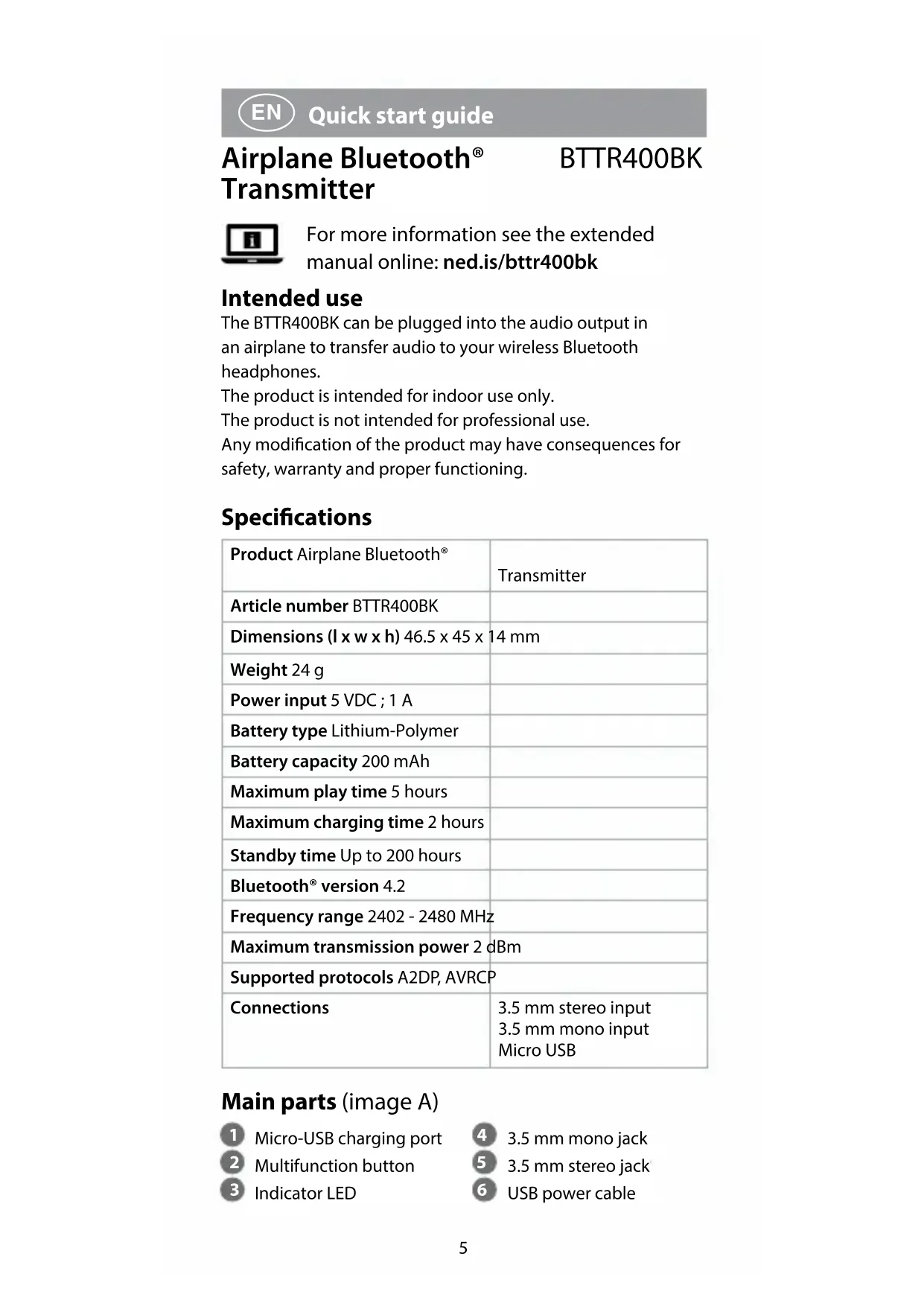 Quick start guide Airplane Bluetooth® Transmitter BTTR400BK For more information see the extended manual online: ned.is/bttr400bk Intended use The BTTR400BK can be plugged into the audio output in an airplane to transfer audio to your wireless Bluetooth headphones. The product is intended for indoor use only. The product is not intended for professional use. Any modication of the product may have consequences for safety, warranty and proper functioning. Specications Product Airplane Bluetooth® Transmitter Article number BTTR400BK Dimensions (l x w x h) 46.5 x 45 x 14 mm Weight 24 g Power input 5 VDC ; 1 A Battery type Lithium-Polymer Battery capacity 200 mAh Maximum play time 5 hours Maximum charging time 2 hours Standby time Up to 200 hours Bluetooth® version 4.2 Frequency range 2402 - 2480 MHz Maximum transmission power 2 dBm Supported protocols A2DP, AVRCP Connections 3.5 mm stereo input