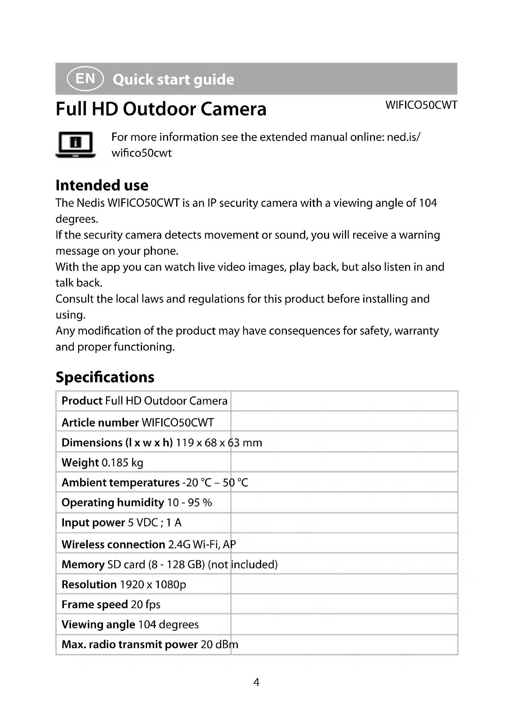 Quick start guide Full HD Outdoor Camera WIFICO50CWT For more information see the extended manual online: ned.is/ wico50cwt Intended use The Nedis WIFICO50CWT is an IP security camera with a viewing angle of 104 degrees. If the security camera detects movement or sound, you will receive a warning message on your phone. With the app you can watch live video images, play back, but also listen in and talk back. Consult the local laws and regulations for this product before installing and using. Any modication of the product may have consequences for safety, warranty and proper functioning. Specications Product Full HD Outdoor Camera Article number WIFICO50CWT Dimensions (l x w x h) 119 x 68 x 63 mm Weight 0.185 kg Ambient temperatures -20 °C – 50 °C Operating humidity 10 - 95 % Input power 5 VDC ; 1 A Wireless connection 2.4G Wi-Fi, AP Memory SD card (8 - 128 GB) (not included) Resolution 1920 x 1080p Frame speed 20 fps Viewing angle 104 degrees Max. radio transmit power 20 dBm5 Antenna gain 2 dBi Frequency range 2412 - 2472 MHz Waterproof IP65 Main parts (image A) 1 Microphone 2 Camera lens 3 Status indicator LED 4 Screws 5 MicroSD card cover 6 Speaker 7 Reset button 8 MicroSD card slot 9 Power input q Ethernet port w Power adapter Safety instructions