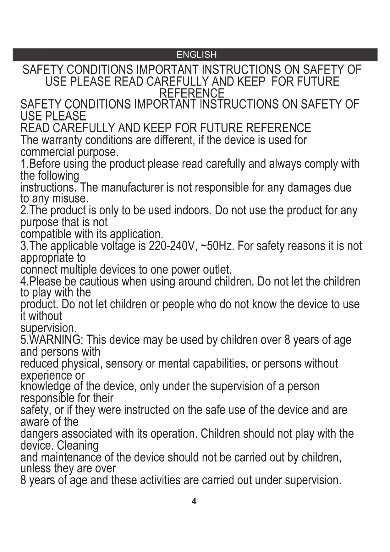 instructions. The manufacturer is not responsible for any damages due to any misuse. SAFETY CONDITIONS IMPORTANT INSTRUCTIONS ON SAFETY OF USE PLEASE The warranty conditions are different, if the device is used for commercial purpose. reduced physical, sensory or mental capabilities, or persons without experience or READ CAREFULLY AND KEEP FOR FUTURE REFERENCE SAFETY CONDITIONS IMPORTANT INSTRUCTIONS ON SAFETY OF USE PLEASE READ CAREFULLY AND KEEP FOR FUTURE REFERENCE connect multiple devices to one power outlet. 2.The product is only to be used indoors. Do not use the product for any purpose that is not 3.The applicable voltage is 220-240V, ~50Hz. For safety reasons it is not appropriate to 4.Please be cautious when using around children. Do not let the children to play with the 5.WARNING: This device may be used by children over 8 years of age and persons with 1.Before using the product please read carefully and always comply with the following compatible with its application. safety, or if they were instructed on the safe use of the device and are aware of the product. Do not let children or people who do not know the device to use it without dangers associated with its operation. Children should not play with the device. Cleaning supervision. knowledge of the device, only under the supervision of a person responsible for their and maintenance of the device should not be carried out by children, unless they are over 8 years of age and these activities are carried out under supervision.5 product in humid conditions. 8.Periodically check the power cable condition. If the power cable is damaged the product the power outlet holding the outlet with your hand. Never pull the power cable!!! 6.After you are finished using the product always remember to gently remove the plug from product to the atmospheric conditions such as direct sun light or rain, etc.. Never use the should be turned to a professional service location to be replaced in order to avoid any other way or if it does not work properly. Do not try to repair the defected product hazardous situations. professional service location in order to repair it. All the repairs can be done only by 11.Never use the product close to combustibles. authorized service professionals. The repair that was done incorrectly can cause yourself because it can lead to electric shock. Always turn the damaged device to a 9.Never use the product with a damaged power cable or if it was dropped or damaged in 7.Never put the power cable, the plug or the whole device into the water. Never expose the hazardous situations for the user. 10.Never put the product on or close to the hot or warm surfaces or the kitchen appliances 14.In order to provide additional protection, it is recommended to install residue current 13.Never leave the product connected to the power source without supervision. Even when use is interrupted for a short time, turn it off from the network, unplug the power. like the electric oven or gas burner. 12.Do not let cord hang over edge of counter or touch hot surfaces.6 26.Small parts may present a choking hazard. 30.Opening the device will destroy the appliance and invalidate the warranty. instruction concerning use of the appliance in a safe way and understand the hazards involved. device (RCD) in the power circuit, with residual current rating not more than 30 mA. 19.The toothbrush is not intended for use by children under age three. Children aged from 3 years and persons with reduced physical, sensory or mental capabilities or lack of experience and knowledge can use the toothbrush, if they have been given supervision or 17.A damaged or non-functioning unit should no longer be used. Contact professional electrician in this matter 24.If the product is dropped, the brush head/irrigator jet should be replaced before the next use even if no damage is visible. 15.The appliance must be mounted in a way that it cannot fall into water or drop to the floor. The plug should always be accessible. 18.Do not modify or repair the product. This may cause fire, electric shock or injury. 28.Do not reach for it when fallen into water. Unplug immediately. 29.Do not open and disassemble device. For battery recycling please dispose whole device according to local environmental regulations.