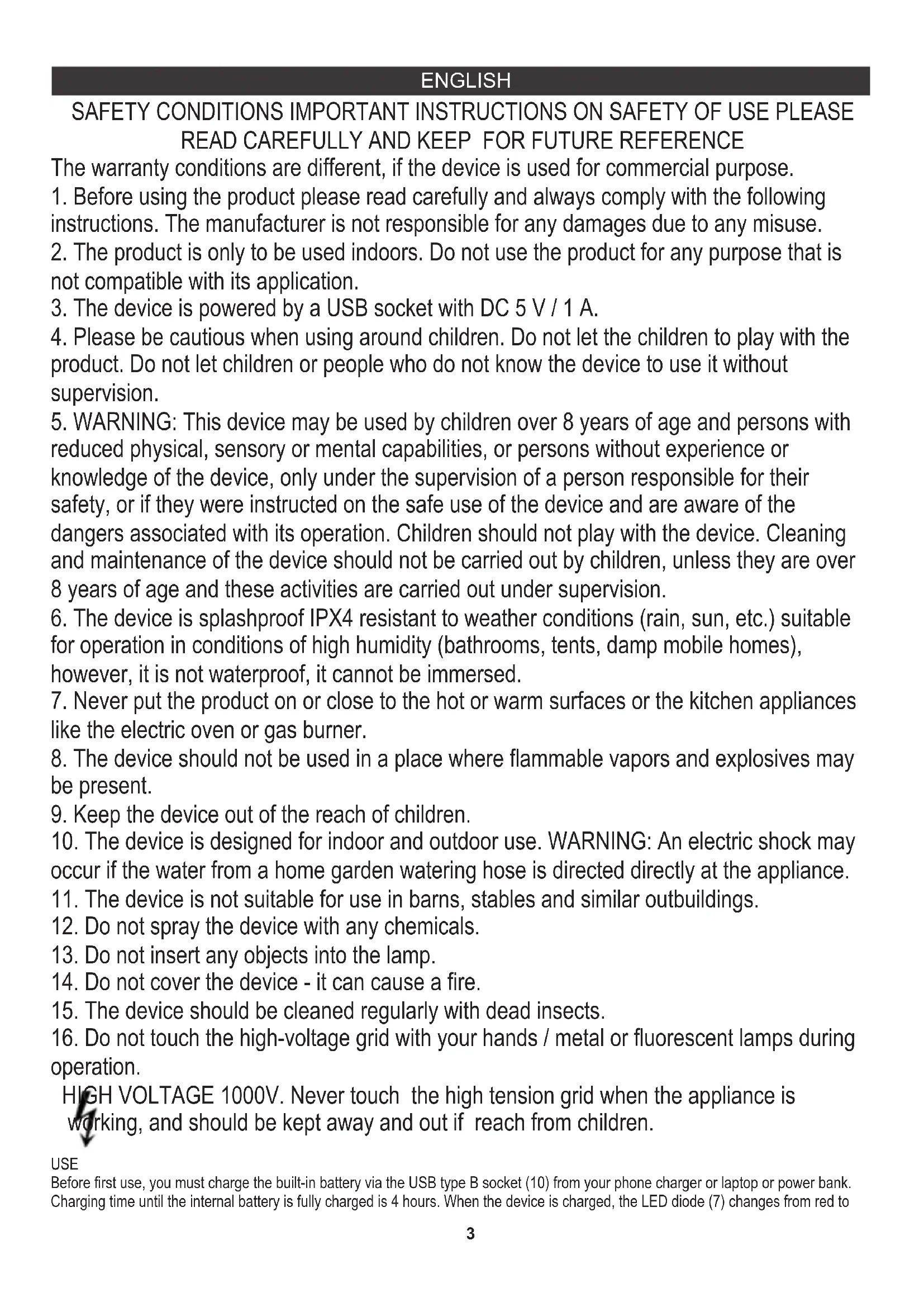operation. HIGH VOLTAGE 1000V. Never touch the high tension grid when the appliance is working, and should be kept away and out if reach from children. USE Before first use, you must charge the built-in battery via the USB type B socket (10) from your phone charger or laptop or power bank. Charging time until the internal battery is fully charged is 4 hours. When the device is charged, the LED diode (7) changes from red to ENGLISH4 green. Working time is 10-16 hours, it depends on the number of discharges of the insecticide lamp (the number of insects neutralized) and the selected level of light intensity of the camping lamp. The device is resistant to rain, sun and moisture, but do not soak it. DESCRIPTION OF THE DEVICE: CR7935 insecticidal lamp