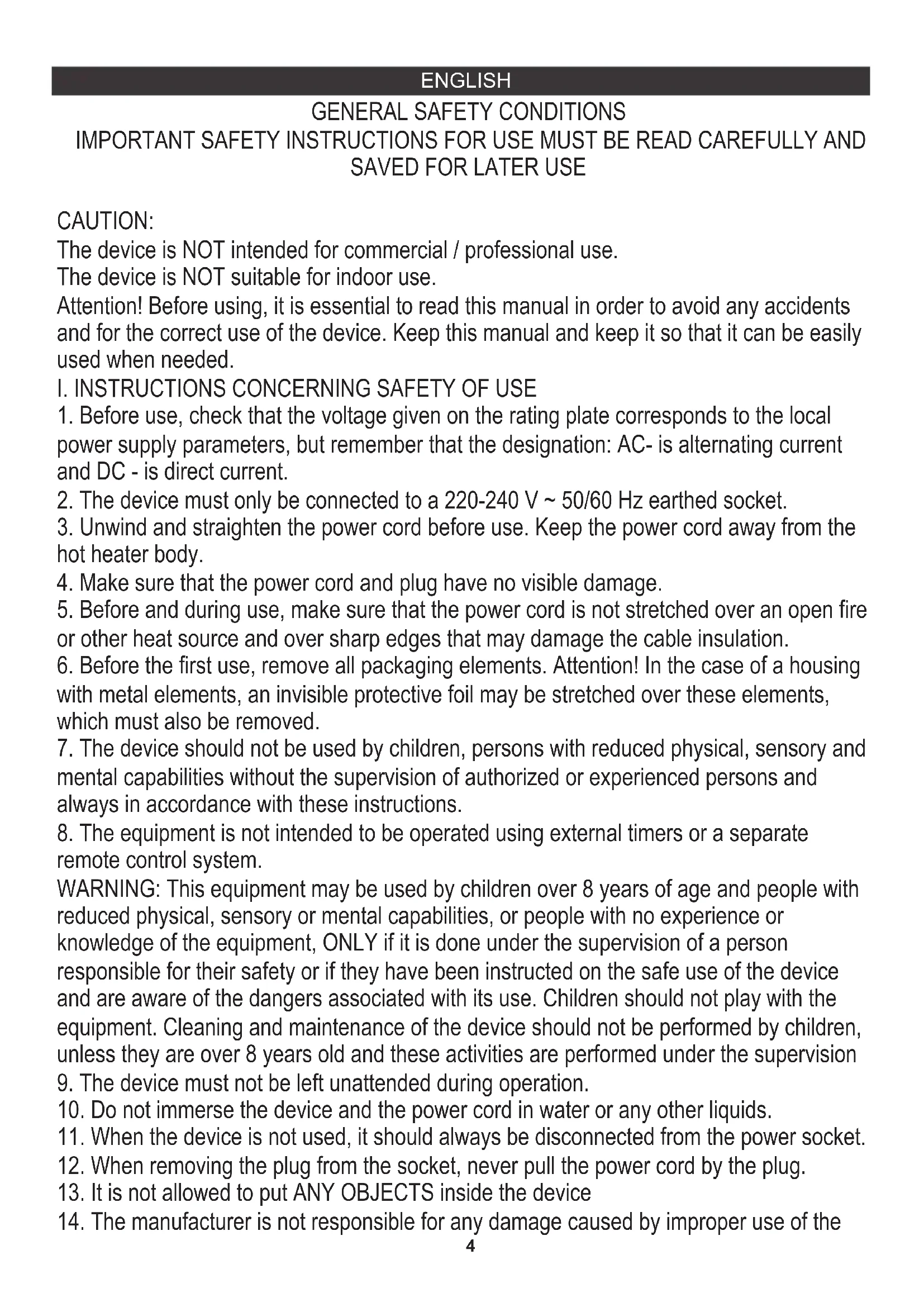 reduced physical, sensory or mental capabilities, or people with no experience or knowledge of the equipment, ONLY if it is done under the supervision of a person responsible for their safety or if they have been instructed on the safe use of the device and are aware of the dangers associated with its use. Children should not play with the equipment. Cleaning and maintenance of the device should not be performed by children, unless they are over 8 years old and these activities are performed under the supervision