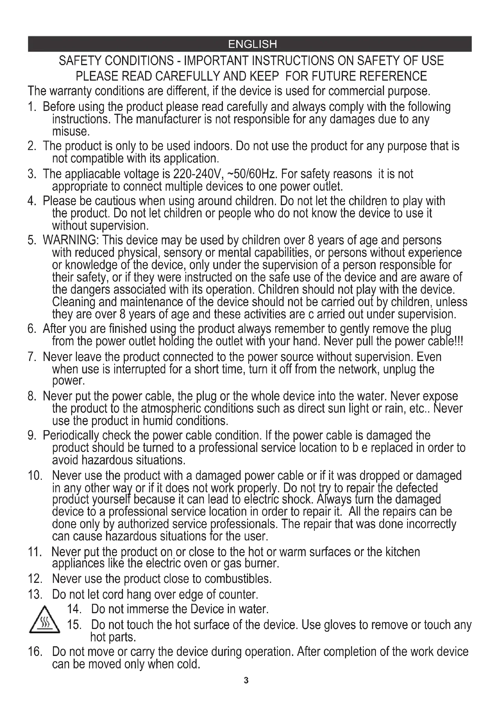 instructions. The manufacturer is not responsible for any damages due to any misuse. The warranty conditions are different, if the device is used for commercial purpose. PLEASE READ CAREFULLY AND KEEP FOR FUTURE REFERENCE SAFETY CONDITIONS - IMPORTANT INSTRUCTIONS ON SAFETY OF USE ENGLISH4