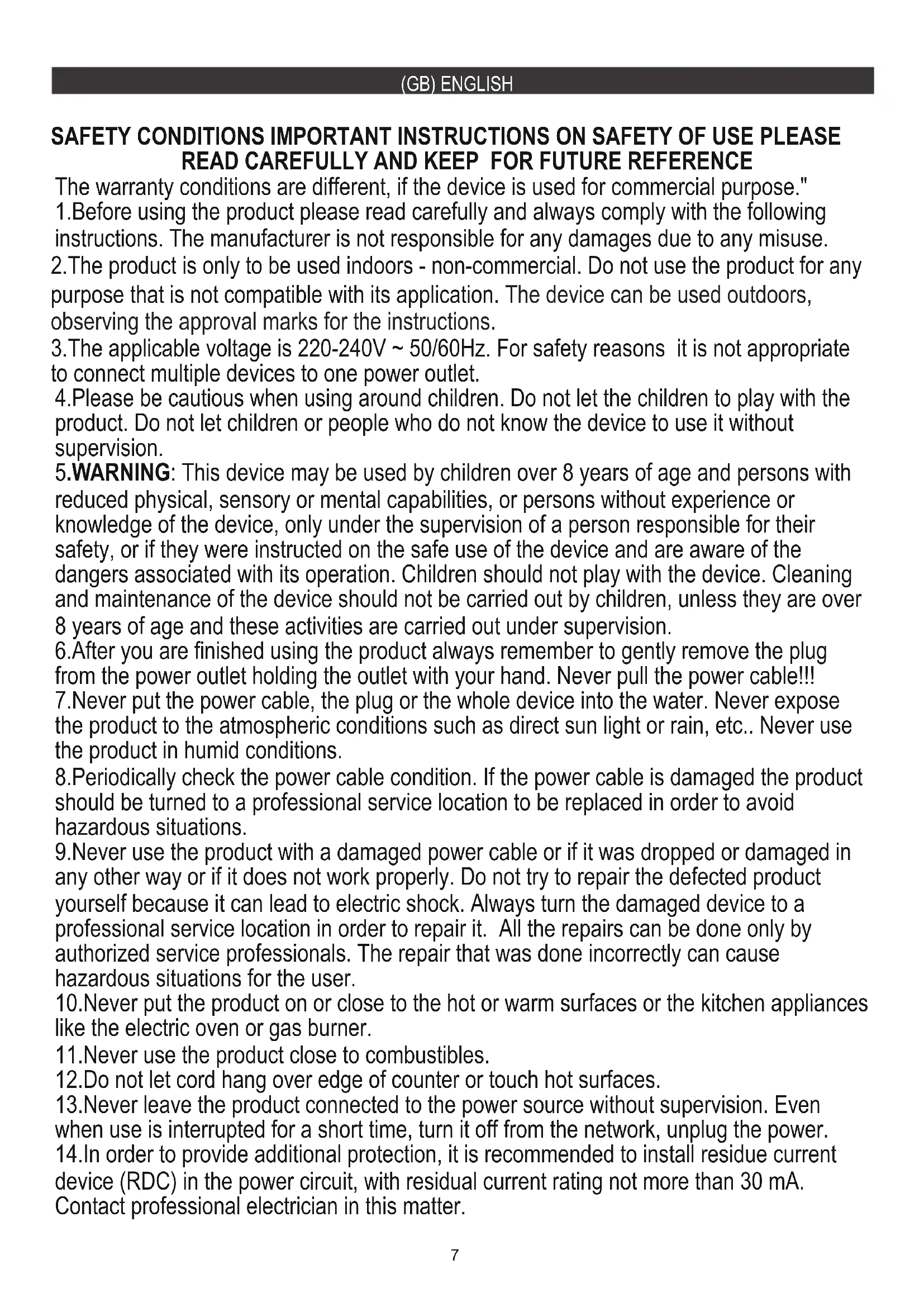 DCT-004A7 8.Periodically check the power cable condition. If the power cable is damaged the product should be turned to a professional service location to be replaced in order to avoid hazardous situations. 3.The applicable voltage is 220-240V ~ 50/60Hz. For safety reasons it is not appropriate to connect multiple devices to one power outlet. 4.Please be cautious when using around children. Do not let the children to play with the product. Do not let children or people who do not know the device to use it without supervision. 2.The product is only to be used indoors - non-commercial. Do not use the product for any purpose that is not compatible with its application. The device can be used outdoors, observing the approval marks for the instructions. 6.After you are finished using the product always remember to gently remove the plug from the power outlet holding the outlet with your hand. Never pull the power cable!!! The warranty conditions are different, if the device is used for commercial purpose." 1.Before using the product please read carefully and always comply with the following instructions. The manufacturer is not responsible for any damages due to any misuse. 10.Never put the product on or close to the hot or warm surfaces or the kitchen appliances like the electric oven or gas burner. 11.Never use the product close to combustibles. SAFETY CONDITIONS IMPORTANT INSTRUCTIONS ON SAFETY OF USE PLEASE 12.Do not let cord hang over edge of counter or touch hot surfaces. 5.WARNING: This device may be used by children over 8 years of age and persons with reduced physical, sensory or mental capabilities, or persons without experience or knowledge of the device, only under the supervision of a person responsible for their safety, or if they were instructed on the safe use of the device and are aware of the dangers associated with its operation. Children should not play with the device. Cleaning and maintenance of the device should not be carried out by children, unless they are over 8 years of age and these activities are carried out under supervision. 7.Never put the power cable, the plug or the whole device into the water. Never expose the product to the atmospheric conditions such as direct sun light or rain, etc.. Never use the product in humid conditions. 13.Never leave the product connected to the power source without supervision. Even when use is interrupted for a short time, turn it off from the network, unplug the power. 9.Never use the product with a damaged power cable or if it was dropped or damaged in any other way or if it does not work properly. Do not try to repair the defected product yourself because it can lead to electric shock. Always turn the damaged device to a professional service location in order to repair it. All the repairs can be done only by authorized service professionals. The repair that was done incorrectly can cause hazardous situations for the user. READ CAREFULLY AND KEEP FOR FUTURE REFERENCE 14.In order to provide additional protection, it is recommended to install residue current device (RDC) in the power circuit, with residual current rating not more than 30 mA. Contact professional electrician in this matter. (GB) ENGLISH8