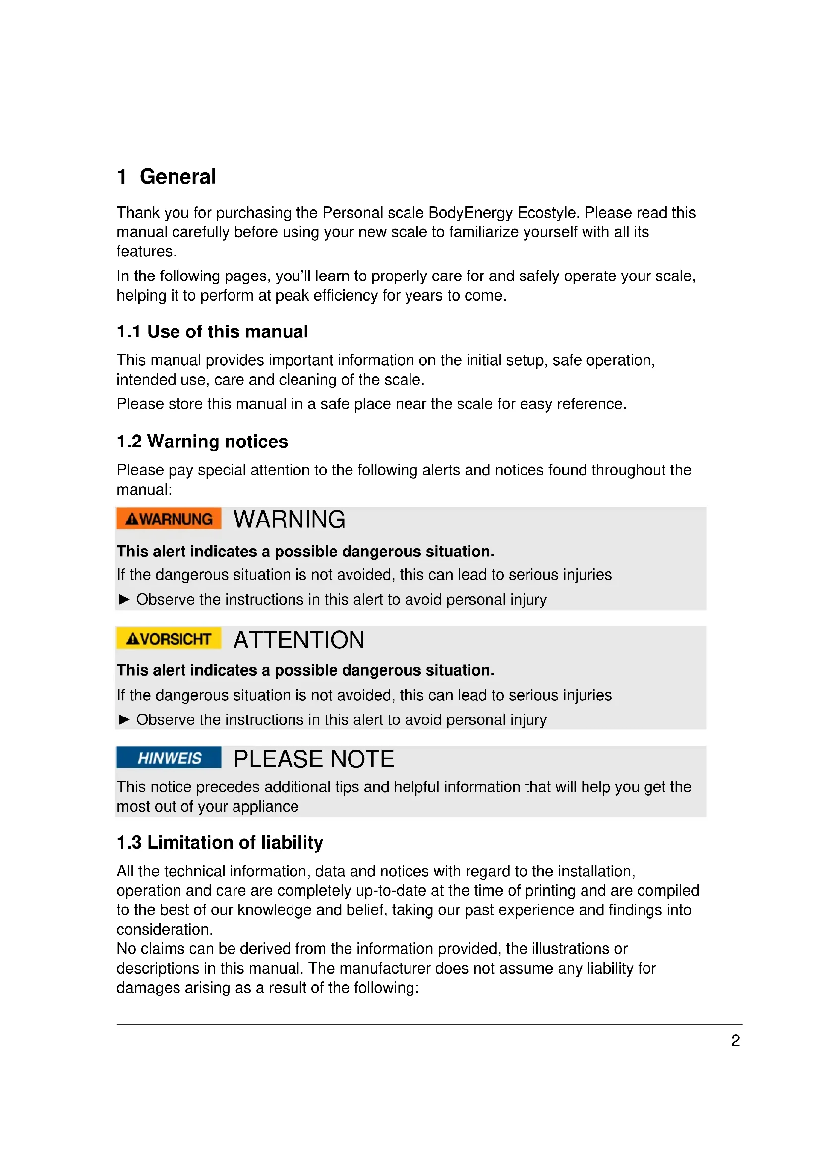 1 General Thank you for purchasing the Personal scale BodyEnergy Ecostyle. Please read this manual carefully before using your new scale to familiarize yourself with all its features. In the following pages, you’ll learn to properly care for and safely operate your scale, helping it to perform at peak efficiency for years to come.