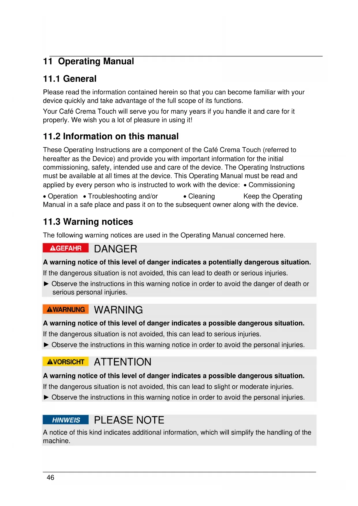 These Operating Instructions are a component of the Café Crema Touch (referred to hereafter as the Device) and provide you with important information for the initial commissioning, safety, intended use and care of the device. The Operating Instructions must be available at all times at the device. This Operating Manual must be read and applied by every person who is instructed to work with the device: • Commissioning